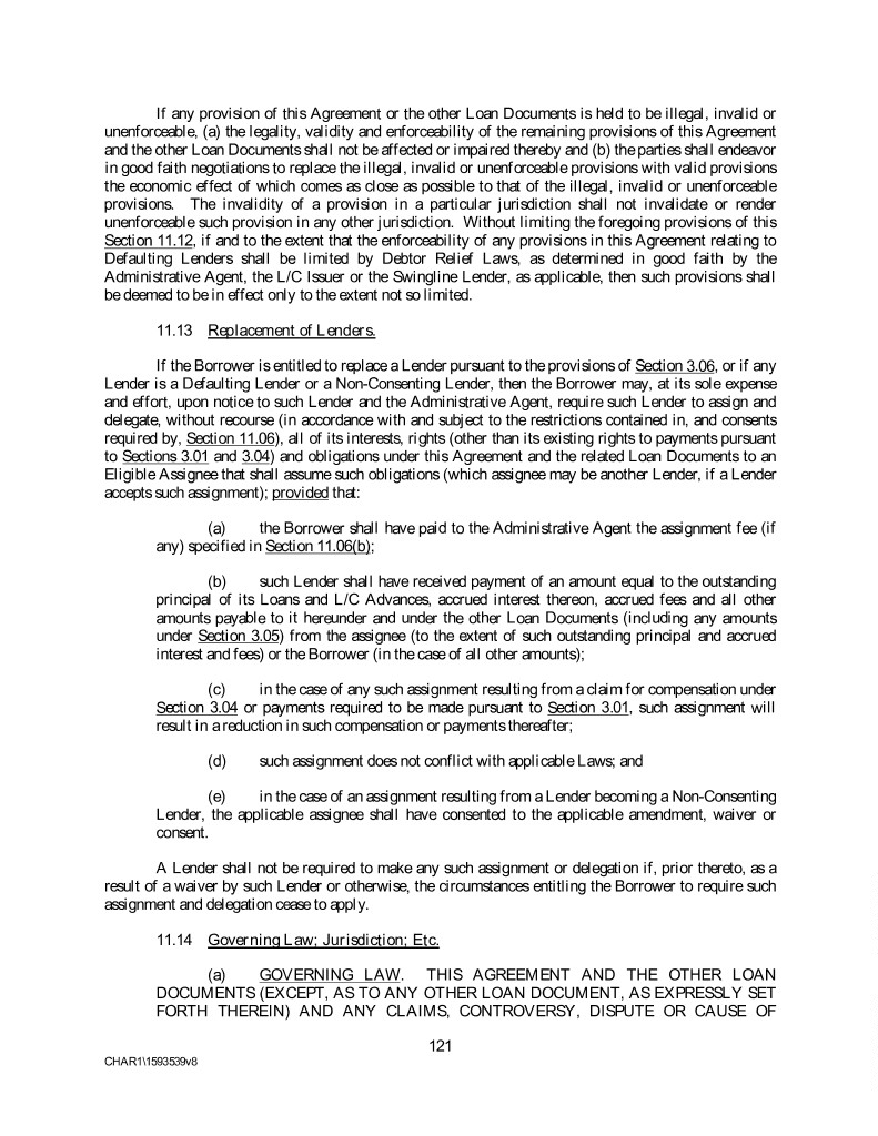 If any provision of this Agreement or the other Loan Documents is held to be illegal, invalid or unenforceable, (a) the legality, validity and enforceability of the remaining provisions of this Agreement and the other Loan Documents shall not be affected or impaired thereby and (b) the parties shall endeavor in good faith negotiations to replace the illegal, invalid or unenforceable provisions with valid provisions the economic effect of which comes as close as possible to that of the illegal, invalid or unenforceable provisions. The invalidity of a provision in a particular jurisdiction shall not invalidate or render unenforceable such provision in any other jurisdiction. Without limiting the foregoing provisions of this Section 11.12, if and to the extent that the enforceability of any provisions in this Agreement relating to Defaulting Lenders shall be limited by Debtor Relief Laws, as determined in good faith by the Administrative Agent, the L/C Issuer or the Swingline Lender, as applicable, then such provisions shall be deemed to be in effect only to the extent not so limited. 11.13 Replacement of Lenders. If the Borrower is entitled to replace a Lender pursuant to the provisions of Section 3.06, or if any Lender is a Defaulting Lender or a Non-Consenting Lender, then the Borrower may, at its sole expense and effort, upon notice to such Lender and the Administrative Agent, require such Lender to assign and delegate, without recourse (in accordance with and subject to the restrictions contained in, and consents required by, Section 11.06), all of its interests, rights (other than its existing rights to payments pursuant to Sections 3.01 and 3.04) and obligations under this Agreement and the related Loan Documents to an Eligible Assignee that shall assume such obligations (which assignee may be another Lender, if a Lender accepts such assignment); provided that: (a) the Borrower shall have paid to the Administrative Agent the assignment fee (if any) specified in Section 11.06(b); (b) such Lender shall have received payment of an amount equal to the outstanding principal of its Loans and L/C Advances, accrued interest thereon, accrued fees and all other amounts payable to it hereunder and under the other Loan Documents (including any amounts under Section 3.05) from the assignee (to the extent of such outstanding principal and accrued interest and fees) or the Borrower (in the case of all other amounts); (c) in the case of any such assignment resulting from a claim for compensation under Section 3.04 or payments required to be made pursuant to Section 3.01, such assignment will result in a reduction in such compensation or payments thereafter; (d) such assignment does not conflict with applicable Laws; and (e) in the case of an assignment resulting from a Lender becoming a Non-Consenting Lender, the applicable assignee shall have consented to the applicable amendment, waiver or consent. A Lender shall not be required to make any such assignment or delegation if, prior thereto, as a result of a waiver by such Lender or otherwise, the circumstances entitling the Borrower to require such assignment and delegation cease to apply. 11.14 Governing Law; Jurisdiction; Etc. (a) GOVERNING LAW. THIS AGREEMENT AND THE OTHER LOAN DOCUMENTS (EXCEPT, AS TO ANY OTHER LOAN DOCUMENT, AS EXPRESSLY SET FORTH THEREIN) AND ANY CLAIMS, CONTROVERSY, DISPUTE OR CAUSE OF 121 CHAR1\1593539v8