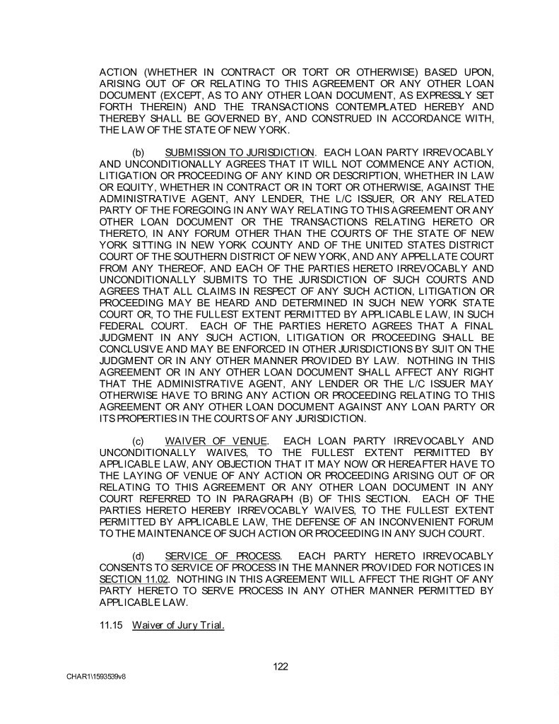ACTION (WHETHER IN CONTRACT OR TORT OR OTHERWISE) BASED UPON, ARISING OUT OF OR RELATING TO THIS AGREEMENT OR ANY OTHER LOAN DOCUMENT (EXCEPT, AS TO ANY OTHER LOAN DOCUMENT, AS EXPRESSLY SET FORTH THEREIN) AND THE TRANSACTIONS CONTEMPLATED HEREBY AND THEREBY SHALL BE GOVERNED BY, AND CONSTRUED IN ACCORDANCE WITH, THE LAW OF THE STATE OF NEW YORK. (b) SUBMISSION TO JURISDICTION. EACH LOAN PARTY IRREVOCABLY AND UNCONDITIONALLY AGREES THAT IT WILL NOT COMMENCE ANY ACTION, LITIGATION OR PROCEEDING OF ANY KIND OR DESCRIPTION, WHETHER IN LAW OR EQUITY, WHETHER IN CONTRACT OR IN TORT OR OTHERWISE, AGAINST THE ADMINISTRATIVE AGENT, ANY LENDER, THE L/C ISSUER, OR ANY RELATED PARTY OF THE FOREGOING IN ANY WAY RELATING TO THIS AGREEMENT OR ANY OTHER LOAN DOCUMENT OR THE TRANSACTIONS RELATING HERETO OR THERETO, IN ANY FORUM OTHER THAN THE COURTS OF THE STATE OF NEW YORK SITTING IN NEW YORK COUNTY AND OF THE UNITED STATES DISTRICT COURT OF THE SOUTHERN DISTRICT OF NEW YORK, AND ANY APPELLATE COURT FROM ANY THEREOF, AND EACH OF THE PARTIES HERETO IRREVOCABLY AND UNCONDITIONALLY SUBMITS TO THE JURISDICTION OF SUCH COURTS AND AGREES THAT ALL CLAIMS IN RESPECT OF ANY SUCH ACTION, LITIGATION OR PROCEEDING MAY BE HEARD AND DETERMINED IN SUCH NEW YORK STATE COURT OR, TO THE FULLEST EXTENT PERMITTED BY APPLICABLE LAW, IN SUCH FEDERAL COURT. EACH OF THE PARTIES HERETO AGREES THAT A FINAL JUDGMENT IN ANY SUCH ACTION, LITIGATION OR PROCEEDING SHALL BE CONCLUSIVE AND MAY BE ENFORCED IN OTHER JURISDICTIONS BY SUIT ON THE JUDGMENT OR IN ANY OTHER MANNER PROVIDED BY LAW. NOTHING IN THIS AGREEMENT OR IN ANY OTHER LOAN DOCUMENT SHALL AFFECT ANY RIGHT THAT THE ADMINISTRATIVE AGENT, ANY LENDER OR THE L/C ISSUER MAY OTHERWISE HAVE TO BRING ANY ACTION OR PROCEEDING RELATING TO THIS AGREEMENT OR ANY OTHER LOAN DOCUMENT AGAINST ANY LOAN PARTY OR ITS PROPERTIES IN THE COURTS OF ANY JURISDICTION. (c) WAIVER OF VENUE. EACH LOAN PARTY IRREVOCABLY AND UNCONDITIONALLY WAIVES, TO THE FULLEST EXTENT PERMITTED BY APPLICABLE LAW, ANY OBJECTION THAT IT MAY NOW OR HEREAFTER HAVE TO THE LAYING OF VENUE OF ANY ACTION OR PROCEEDING ARISING OUT OF OR RELATING TO THIS AGREEMENT OR ANY OTHER LOAN DOCUMENT IN ANY COURT REFERRED TO IN PARAGRAPH (B) OF THIS SECTION. EACH OF THE PARTIES HERETO HEREBY IRREVOCABLY WAIVES, TO THE FULLEST EXTENT PERMITTED BY APPLICABLE LAW, THE DEFENSE OF AN INCONVENIENT FORUM TO THE MAINTENANCE OF SUCH ACTION OR PROCEEDING IN ANY SUCH COURT. (d) SERVICE OF PROCESS. EACH PARTY HERETO IRREVOCABLY CONSENTS TO SERVICE OF PROCESS IN THE MANNER PROVIDED FOR NOTICES IN SECTION 11.02. NOTHING IN THIS AGREEMENT WILL AFFECT THE RIGHT OF ANY PARTY HERETO TO SERVE PROCESS IN ANY OTHER MANNER PERMITTED BY APPLICABLE LAW. 11.15 Waiver of Jury Trial. 122 CHAR1\1593539v8