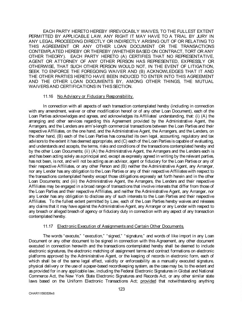 EACH PARTY HERETO HEREBY IRREVOCABLY WAIVES, TO THE FULLEST EXTENT PERMITTED BY APPLICABLE LAW, ANY RIGHT IT MAY HAVE TO A TRIAL BY JURY IN ANY LEGAL PROCEEDING DIRECTLY OR INDIRECTLY ARISING OUT OF OR RELATING TO THIS AGREEMENT OR ANY OTHER LOAN DOCUMENT OR THE TRANSACTIONS CONTEMPLATED HEREBY OR THEREBY (WHETHER BASED ON CONTRACT, TORT OR ANY OTHER THEORY). EACH PARTY HERETO (A) CERTIFIES THAT NO REPRESENTATIVE, AGENT OR ATTORNEY OF ANY OTHER PERSON HAS REPRESENTED, EXPRESSLY OR OTHERWISE, THAT SUCH OTHER PERSON WOULD NOT, IN THE EVENT OF LITIGATION, SEEK TO ENFORCE THE FOREGOING WAIVER AND (B) ACKNOWLEDGES THAT IT AND THE OTHER PARTIES HERETO HAVE BEEN INDUCED TO ENTER INTO THIS AGREEMENT AND THE OTHER LOAN DOCUMENTS BY, AMONG OTHER THINGS, THE MUTUAL WAIVERS AND CERTIFICATIONS IN THIS SECTION. 11.16 No Advisory or Fiduciary Responsibility. In connection with all aspects of each transaction contemplated hereby (including in connection with any amendment, waiver or other modification hereof or of any other Loan Document), each of the Loan Parties acknowledges and agrees, and acknowledges its Affiliates’ understanding, that: (i) (A) the arranging and other services regarding this Agreement provided by the Administrative Agent, the Arrangers, and the Lenders are arm’s-length commercial transactions between the Loan Parties and their respective Affiliates, on the one hand, and the Administrative Agent, the Arrangers, and the Lenders, on the other hand, (B) each of the Loan Parties has consulted its own legal, accounting, regulatory and tax advisors to the extent it has deemed appropriate, and (C) each of the Loan Parties is capable of evaluating, and understands and accepts, the terms, risks and conditions of the transactions contemplated hereby and by the other Loan Documents; (ii) (A) the Administrative Agent, the Arrangers and the Lenders each is and has been acting solely as a principal and, except as expressly agreed in writing by the relevant parties, has not been, is not, and will not be acting as an advisor, agent or fiduciary for the Loan Parties or any of their respective Affiliates, or any other Person and (B) neither the Administrative Agent, any Arranger, nor any Lender has any obligation to the Loan Parties or any of their respective Affiliates with respect to the transactions contemplated hereby except those obligations expressly set forth herein and in the other Loan Documents; and (iii) the Administrative Agent, the Arrangers, the Lenders and their respective Affiliates may be engaged in a broad range of transactions that involve interests that differ from those of the Loan Parties and their respective Affiliates, and neither the Administrative Agent, any Arranger, nor any Lender has any obligation to disclose any of such interests to the Loan Parties and their respective Affiliates. To the fullest extent permitted by Law, each of the Loan Parties hereby waives and releases any claims that it may have against the Administrative Agent, any Arranger or any Lender with respect to any breach or alleged breach of agency or fiduciary duty in connection with any aspect of any transaction contemplated hereby. 11.17 Electronic Execution of Assignments and Certain Other Documents. The words “execute,” “execution,” “signed,” “signature,” and words of like import in any Loan Document or any other document to be signed in connection with this Agreement, any other document executed in connection herewith and the transactions contemplated hereby shall be deemed to include electronic signatures, the electronic matching of assignment terms and contract formations on electronic platforms approved by the Administrative Agent, or the keeping of records in electronic form, each of which shall be of the same legal effect, validity or enforceability as a manually executed signature, physical delivery or the use of a paper-based recordkeeping system, as the case may be, to the extent and as provided for in any applicable law, including the Federal Electronic Signatures in Global and National Commerce Act, the New York State Electronic Signatures and Records Act, or any other similar state laws based on the Uniform Electronic Transactions Act; provided that notwithstanding anything 123 CHAR1\1593539v8