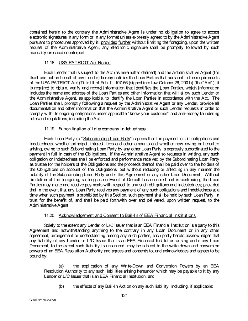 contained herein to the contrary the Administrative Agent is under no obligation to agree to accept electronic signatures in any form or in any format unless expressly agreed to by the Administrative Agent pursuant to procedures approved by it; provided further without limiting the foregoing, upon the written request of the Administrative Agent, any electronic signature shall be promptly followed by such manually executed counterpart. 11.18 USA PATRIOT Act Notice. Each Lender that is subject to the Act (as hereinafter defined) and the Administrative Agent (for itself and not on behalf of any Lender) hereby notifies the Loan Parties that pursuant to the requirements of the USA PATRIOT Act (Title III of Pub. L. 107-56 (signed into law October 26, 2001)) (the “Act”), it is required to obtain, verify and record information that identifies the Loan Parties, which information includes the name and address of the Loan Parties and other information that will allow such Lender or the Administrative Agent, as applicable, to identify the Loan Parties in accordance with the Act. The Loan Parties shall, promptly following a request by the Administrative Agent or any Lender, provide all documentation and other information that the Administrative Agent or such Lender requests in order to comply with its ongoing obligations under applicable “know your customer” and anti-money laundering rules and regulations, including the Act. 11.19 Subordination of Intercompany Indebtedness. Each Loan Party (a “Subordinating Loan Party”) agrees that the payment of all obligations and indebtedness, whether principal, interest, fees and other amounts and whether now owing or hereafter arising, owing to such Subordinating Loan Party by any other Loan Party is expressly subordinated to the payment in full in cash of the Obligations. If the Administrative Agent so requests in writing, any such obligation or indebtedness shall be enforced and performance received by the Subordinating Loan Party as trustee for the holders of the Obligations and the proceeds thereof shall be paid over to the holders of the Obligations on account of the Obligations, but without reducing or affecting in any manner the liability of the Subordinating Loan Party under this Agreement or any other Loan Document. Without limitation of the foregoing, so long as no Event of Default has occurred and is continuing, the Loan Parties may make and receive payments with respect to any such obligations and indebtedness; provided that in the event that any Loan Party receives any payment of any such obligations and indebtedness at a time when such payment is prohibited by this Section, such payment shall be held by such Loan Party, in trust for the benefit of, and shall be paid forthwith over and delivered, upon written request, to the Administrative Agent. 11.20 Acknowledgement and Consent to Bail-In of EEA Financial Institutions. Solely to the extent any Lender or L/C Issuer that is an EEA Financial Institution is a party to this Agreement and notwithstanding anything to the contrary in any Loan Document or in any other agreement, arrangement or understanding among any such parties, each party hereto acknowledges that any liability of any Lender or L/C Issuer that is an EEA Financial Institution arising under any Loan Document, to the extent such liability is unsecured, may be subject to the write-down and conversion powers of an EEA Resolution Authority and agrees and consents to, and acknowledges and agrees to be bound by: (a) the application of any Write-Down and Conversion Powers by an EEA Resolution Authority to any such liabilities arising hereunder which may be payable to it by any Lender or L/C Issuer that is an EEA Financial Institution; and (b) the effects of any Bail-In Action on any such liability, including, if applicable: 124 CHAR1\1593539v8