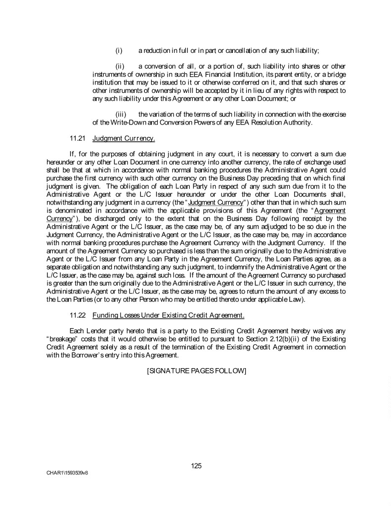 (i) a reduction in full or in part or cancellation of any such liability; (ii) a conversion of all, or a portion of, such liability into shares or other instruments of ownership in such EEA Financial Institution, its parent entity, or a bridge institution that may be issued to it or otherwise conferred on it, and that such shares or other instruments of ownership will be accepted by it in lieu of any rights with respect to any such liability under this Agreement or any other Loan Document; or (iii) the variation of the terms of such liability in connection with the exercise of the Write-Down and Conversion Powers of any EEA Resolution Authority. 11.21 Judgment Currency. If, for the purposes of obtaining judgment in any court, it is necessary to convert a sum due hereunder or any other Loan Document in one currency into another currency, the rate of exchange used shall be that at which in accordance with normal banking procedures the Administrative Agent could purchase the first currency with such other currency on the Business Day preceding that on which final judgment is given. The obligation of each Loan Party in respect of any such sum due from it to the Administrative Agent or the L/C Issuer hereunder or under the other Loan Documents shall, notwithstanding any judgment in a currency (the “Judgment Currency”) other than that in which such sum is denominated in accordance with the applicable provisions of this Agreement (the “Agreement Currency”), be discharged only to the extent that on the Business Day following receipt by the Administrative Agent or the L/C Issuer, as the case may be, of any sum adjudged to be so due in the Judgment Currency, the Administrative Agent or the L/C Issuer, as the case may be, may in accordance with normal banking procedures purchase the Agreement Currency with the Judgment Currency. If the amount of the Agreement Currency so purchased is less than the sum originally due to the Administrative Agent or the L/C Issuer from any Loan Party in the Agreement Currency, the Loan Parties agree, as a separate obligation and notwithstanding any such judgment, to indemnify the Administrative Agent or the L/C Issuer, as the case may be, against such loss. If the amount of the Agreement Currency so purchased is greater than the sum originally due to the Administrative Agent or the L/C Issuer in such currency, the Administrative Agent or the L/C Issuer, as the case may be, agrees to return the amount of any excess to the Loan Parties (or to any other Person who may be entitled thereto under applicable Law). 11.22 Funding Losses Under Existing Credit Agreement. Each Lender party hereto that is a party to the Existing Credit Agreement hereby waives any “breakage” costs that it would otherwise be entitled to pursuant to Section 2.12(b)(ii) of the Existing Credit Agreement solely as a result of the termination of the Existing Credit Agreement in connection with the Borrower’s entry into this Agreement. [SIGNATURE PAGES FOLLOW] 125 CHAR1\1593539v8