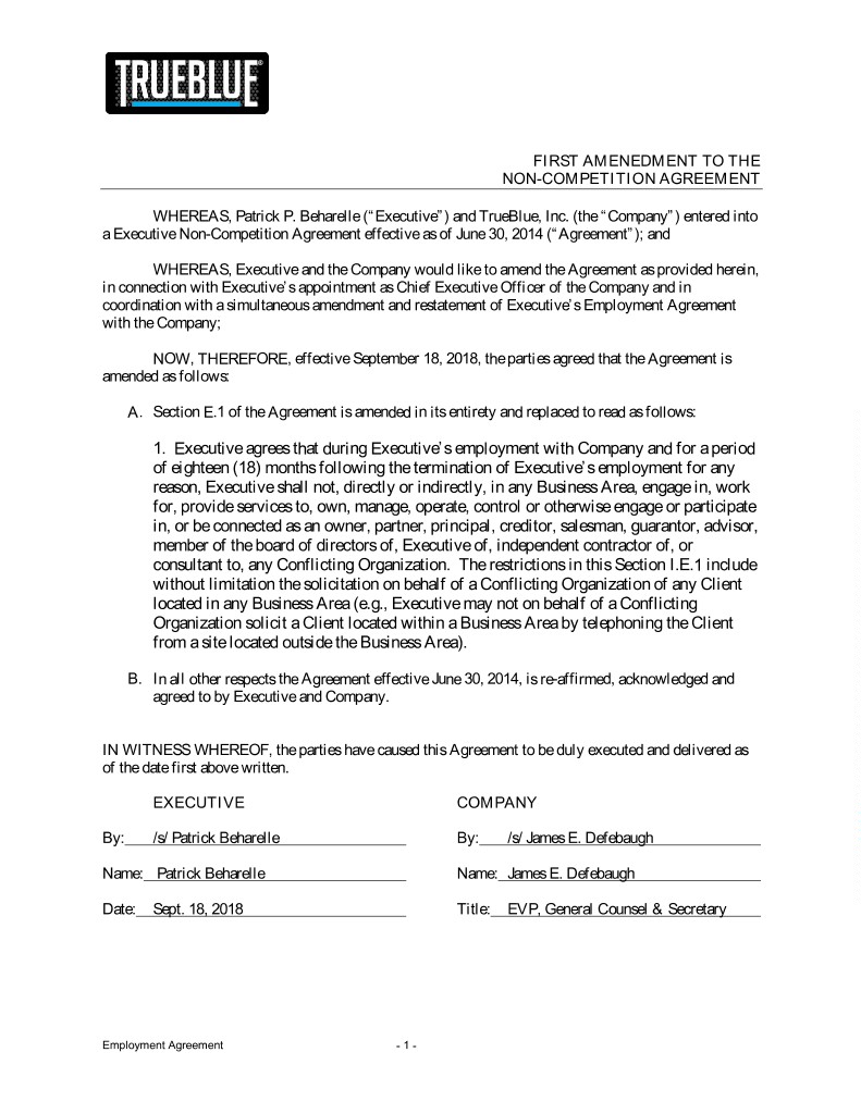 FIRST AMENEDMENT TO THE NON-COMPETITION AGREEMENT WHEREAS, Patrick P. Beharelle (“Executive”) and TrueBlue, Inc. (the “Company”) entered into a Executive Non-Competition Agreement effective as of June 30, 2014 (“Agreement”); and WHEREAS, Executive and the Company would like to amend the Agreement as provided herein, in connection with Executive’s appointment as Chief Executive Officer of the Company and in coordination with a simultaneous amendment and restatement of Executive’s Employment Agreement with the Company; NOW, THEREFORE, effective September 18, 2018, the parties agreed that the Agreement is amended as follows: A. Section E.1 of the Agreement is amended in its entirety and replaced to read as follows: 1. Executive agrees that during Executive’s employment with Company and for a period of eighteen (18) months following the termination of Executive’s employment for any reason, Executive shall not, directly or indirectly, in any Business Area, engage in, work for, provide services to, own, manage, operate, control or otherwise engage or participate in, or be connected as an owner, partner, principal, creditor, salesman, guarantor, advisor, member of the board of directors of, Executive of, independent contractor of, or consultant to, any Conflicting Organization. The restrictions in this Section I.E.1 include without limitation the solicitation on behalf of a Conflicting Organization of any Client located in any Business Area (e.g., Executive may not on behalf of a Conflicting Organization solicit a Client located within a Business Area by telephoning the Client from a site located outside the Business Area). B. In all other respects the Agreement effective June 30, 2014, is re-affirmed, acknowledged and agreed to by Executive and Company. IN WITNESS WHEREOF, the parties have caused this Agreement to be duly executed and delivered as of the date first above written. EXECUTIVE COMPANY By: /s/ Patrick Beharelle By: /s/ James E. Defebaugh Name: Patrick Beharelle Name: James E. Defebaugh Date: Sept. 18, 2018 Title: EVP, General Counsel & Secretary Employment Agreement - 1 -