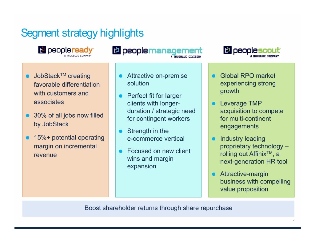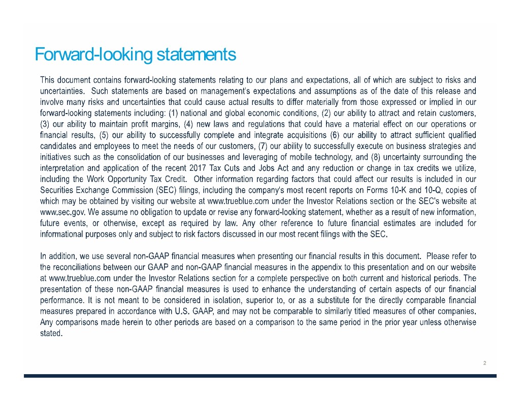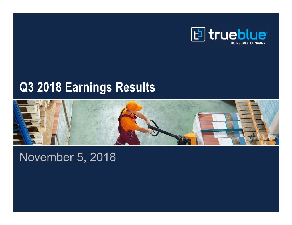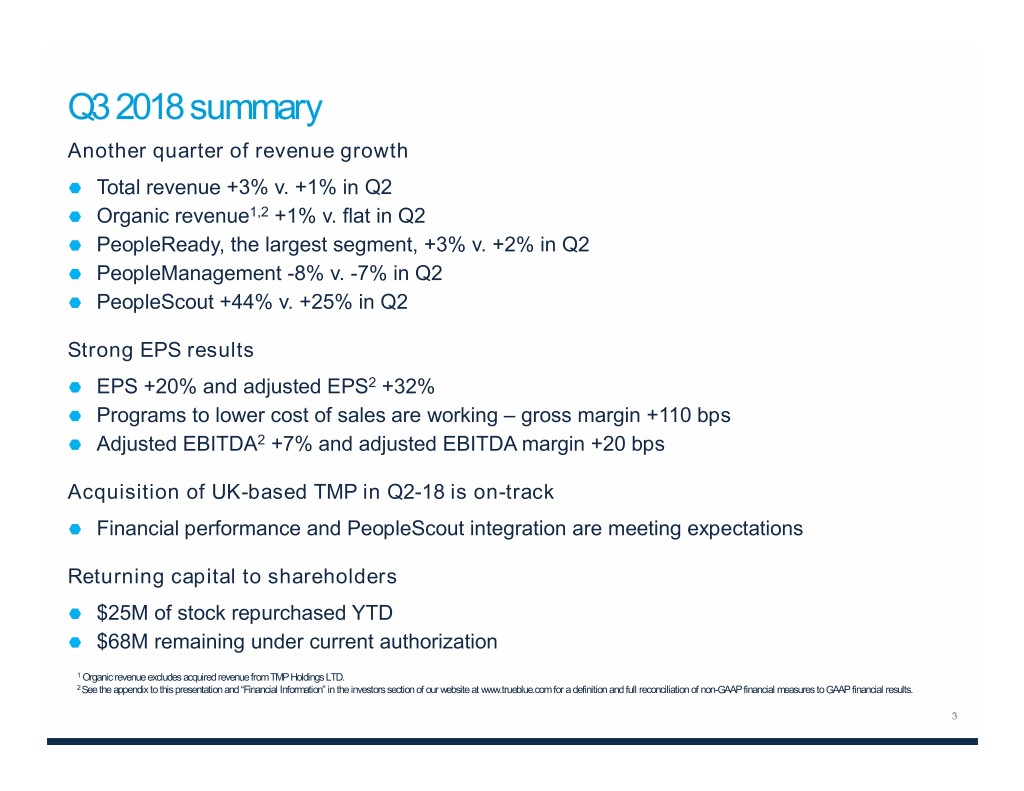 Q3 2018 summary Another quarter of revenue growth Total revenue +3% v. +1% in Q2 Organic revenue1,2 +1% v. flat in Q2 PeopleReady, the largest segment, +3% v. +2% in Q2 PeopleManagement -8% v. -7% in Q2 PeopleScout +44% v. +25% in Q2 Strong EPS results EPS +20% and adjusted EPS2 +32% Programs to lower cost of sales are working – gross margin +110 bps Adjusted EBITDA2 +7% and adjusted EBITDA margin +20 bps Acquisition of UK-based TMP in Q2-18 is on-track Financial performance and PeopleScout integration are meeting expectations Returning capital to shareholders $25M of stock repurchased YTD $68M remaining under current authorization 1 Organic revenue excludes acquired revenue from TMP Holdings LTD. 2 See the appendix to this presentation and “Financial Information” in the investors section of our website at www.trueblue.com for a definition and full reconciliation of non-GAAP financial measures to GAAP financial results.