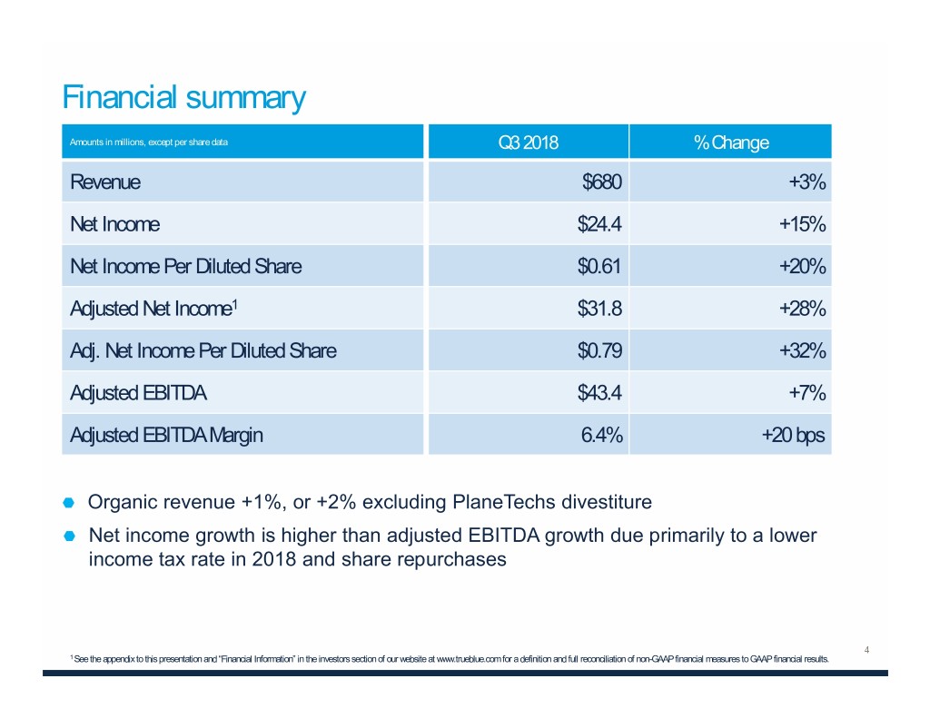 Financial summary Amounts in millions, except per share data Q3 2018 % Change Revenue $680 +3% Net Income $24.4 +15% Net Income Per Diluted Share $0.61 +20% Adjusted Net Income1 $31.8 +28% Adj. Net Income Per Diluted Share $0.79 +32% Adjusted EBITDA $43.4 +7% Adjusted EBITDA Margin 6.4% +20 bps Organic revenue +1%, or +2% excluding PlaneTechs divestiture Net income growth is higher than adjusted EBITDA growth due primarily to a lower income tax rate in 2018 and share repurchases 1 See the appendix to this presentation and “Financial Information” in the investors section of our website at www.trueblue.com for a definition and full reconciliation of non-GAAP financial measures to GAAP financial results.