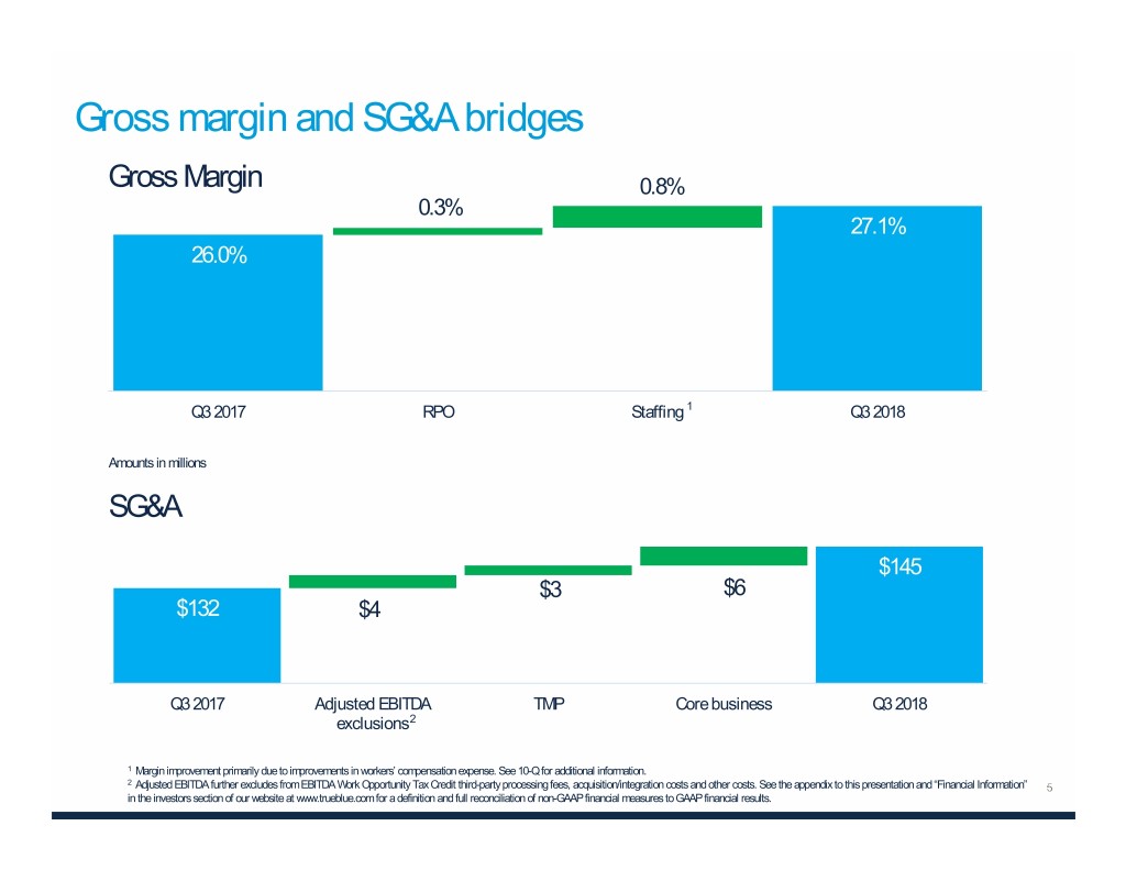 Gross margin and SG&A bridges Gross Margin 0.8% 0.3% 27.1% 26.0% Q3 2017 RPO Staffing1 Q3 2018 Amounts in millions SG&A $145 $3 $6 $132 $4 Q3 2017 Adjusted EBITDA TMP Core business Q3 2018 exclusions2 1 Margin improvement primarily due to improvements in workers’ compensation expense. See 10-Q for additional information. 2 Adjusted EBITDA further excludes from EBITDA Work Opportunity Tax Credit third-party processing fees, acquisition/integration costs and other costs. See the appendix to this presentation and “Financial Information” in the investors section of our website at www.trueblue.com for a definition and full reconciliation of non-GAAP financial measures to GAAP financial results.