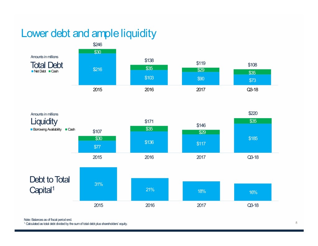 Lower debt and ample liquidity $246 $30 Amounts in millions $138 Total Debt $119 $108 $216 $35 $29 Net Debt Cash $35 $103 $90 $73 2015 2016 2017 Q3-18 Amounts in millions $220 $171 $35 Liquidity $146 Borrowing Availability Cash $35 $107 $29 $30 $185 $136 $117 $77 2015 2016 2017 Q3-18 Debt to Total 31% 1 21% Capital 18% 16% 2015 2016 2017 Q3-18 Note: Balances as of fiscal period end. 1 Calculated as total debt divided by the sum of total debt plus shareholders’ equity.