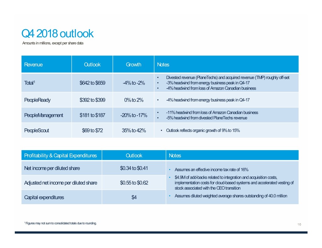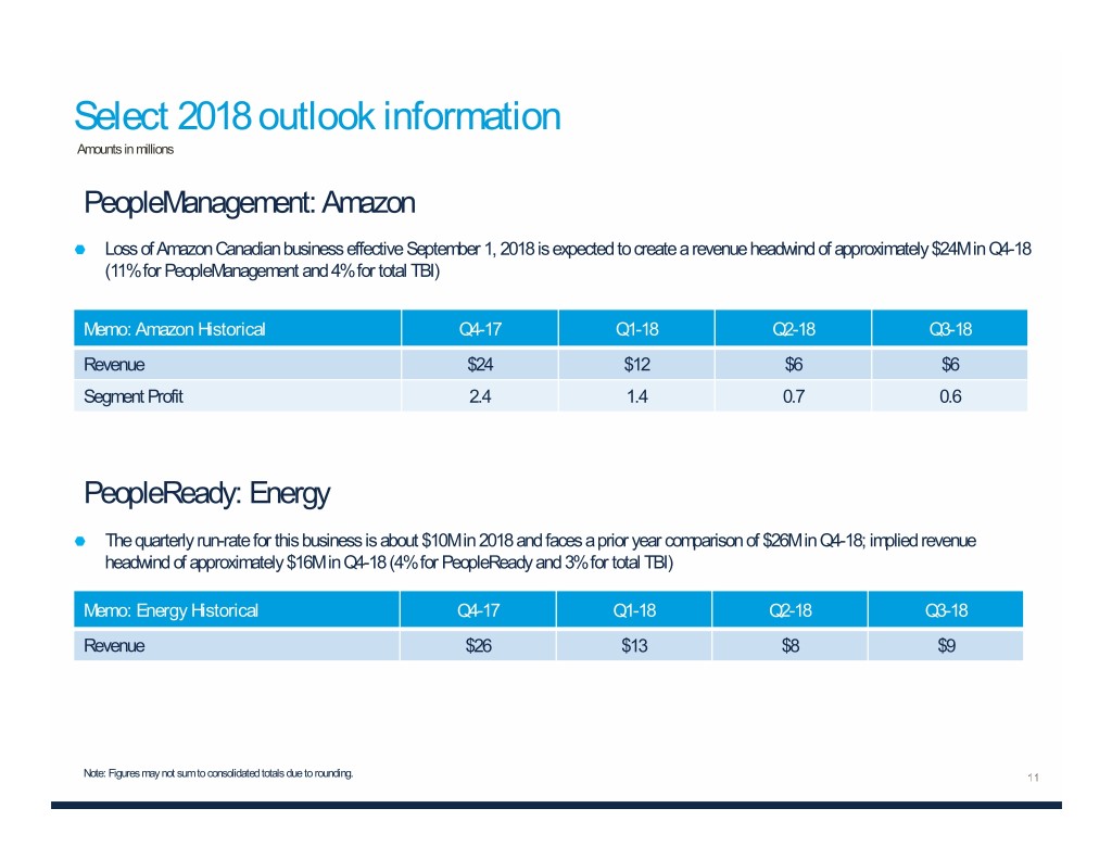 Select 2018 outlook information Amounts in millions PeopleManagement: Amazon Loss of Amazon Canadian business effective September 1, 2018 is expected to create a revenue headwind of approximately $24M in Q4-18 (11% for PeopleManagement and 4% for total TBI) Memo: Amazon Historical Q4-17 Q1-18 Q2-18 Q3-18 Revenue $24 $12 $6 $6 Segment Profit 2.4 1.4 0.7 0.6 PeopleReady: Energy The quarterly run-rate for this business is about $10M in 2018 and faces a prior year comparison of $26M in Q4-18; implied revenue headwind of approximately $16M in Q4-18 (4% for PeopleReady and 3% for total TBI) Memo: Energy Historical Q4-17 Q1-18 Q2-18 Q3-18 Revenue $26 $13 $8 $9 Note: Figures may not sum to consolidated totals due to rounding.