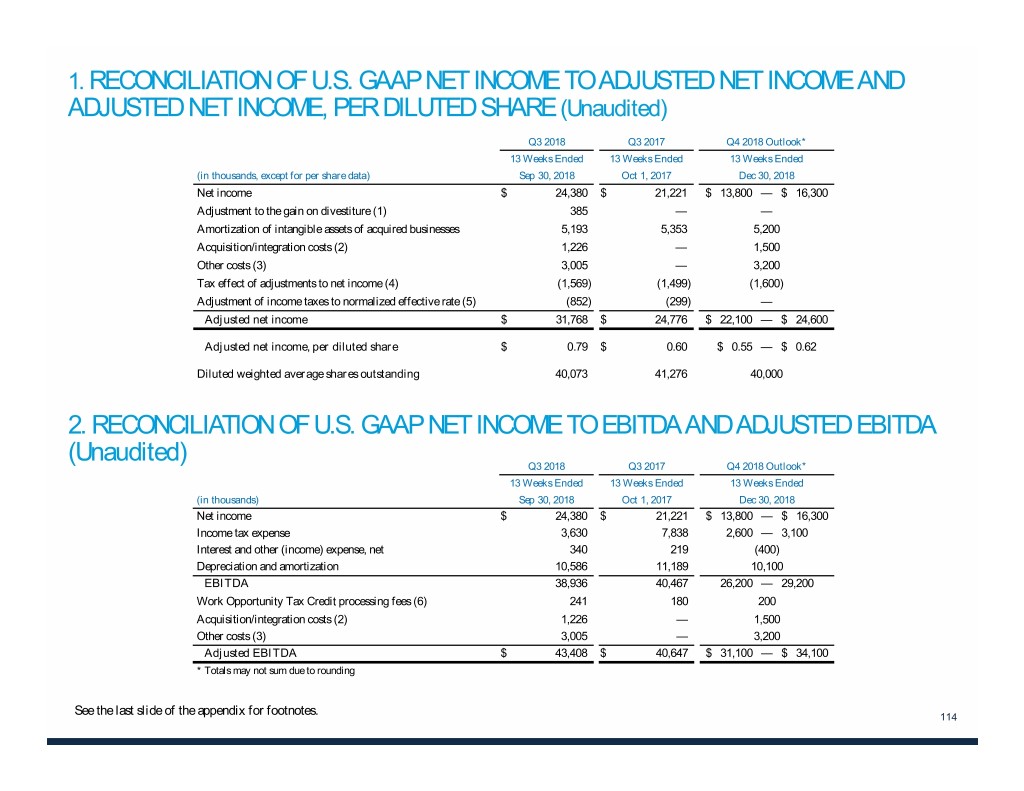 1. RECONCILIATION OF U.S. GAAP NET INCOME TO ADJUSTED NET INCOME AND ADJUSTED NET INCOME, PER DILUTED SHARE (Unaudited) Q3 2018 Q3 2017 Q4 2018 Outlook* 13 Weeks Ended 13 Weeks Ended 13 Weeks Ended (in thousands, except for per share data) Sep 30, 2018 Oct 1, 2017 Dec 30, 2018 Net income $ 24,380 $ 21,221 $ 13,800 — $ 16,300 Adjustment to the gain on divestiture (1) 385 — — Amortization of intangible assets of acquired businesses 5,193 5,353 5,200 Acquisition/integration costs (2) 1,226 — 1,500 Other costs (3) 3,005 — 3,200 Tax effect of adjustments to net income (4) (1,569) (1,499) (1,600) Adjustment of income taxes to normalized effective rate (5) (852) (299) — Adjusted net income $ 31,768 $ 24,776 $ 22,100 — $ 24,600 Adjusted net income, per diluted share $ 0.79 $ 0.60 $ 0.55 — $ 0.62 Diluted weighted average shares outstanding 40,073 41,276 40,000 2. RECONCILIATION OF U.S. GAAP NET INCOME TO EBITDA AND ADJUSTED EBITDA (Unaudited) Q3 2018 Q3 2017 Q4 2018 Outlook* 13 Weeks Ended 13 Weeks Ended 13 Weeks Ended (in thousands) Sep 30, 2018 Oct 1, 2017 Dec 30, 2018 Net income $ 24,380 $ 21,221 $ 13,800 — $ 16,300 Income tax expense 3,630 7,838 2,600 — 3,100 Interest and other (income) expense, net 340 219 (400) Depreciation and amortization 10,586 11,189 10,100 EBITDA 38,936 40,467 26,200 — 29,200 Work Opportunity Tax Credit processing fees (6) 241 180 200 Acquisition/integration costs (2) 1,226 — 1,500 Other costs (3) 3,005 — 3,200 Adjusted EBITDA $ 43,408 $ 40,647 $ 31,100 — $ 34,100 * Totals may not sum due to rounding See the last slide of the appendix for footnotes. 114