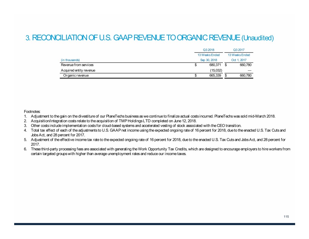 3. RECONCILIATION OF U.S. GAAP REVENUE TO ORGANIC REVENUE (Unaudited) Q3 2018 Q3 2017 13 Weeks Ended 13 Weeks Ended (in thousands) Sep 30, 2018 Oct 1, 2017 Revenue from services $ 680,371 $ 660,780 Acquired entity revenue (15,032) — Organic revenue $ 665,339 $ 660,780 Footnotes: 1. Adjustment to the gain on the divestiture of our PlaneTechs business as we continue to finalize actual costs incurred. PlaneTechs was sold mid-March 2018. 2. Acquisition/integration costs relate to the acquisition of TMP Holdings LTD completed on June 12, 2018. 3. Other costs include implementation costs for cloud-based systems and accelerated vesting of stock associated with the CEO transition. 4. Total tax effect of each of the adjustments to U.S. GAAP net income using the expected ongoing rate of 16 percent for 2018, due to the enacted U.S. Tax Cuts and Jobs Act, and 28 percent for 2017. 5. Adjustment of the effective income tax rate to the expected ongoing rate of 16 percent for 2018, due to the enacted U.S. Tax Cuts and Jobs Act, and 28 percent for 2017. 6. These third-party processing fees are associated with generating the Work Opportunity Tax Credits, which are designed to encourage employers to hire workers from certain targeted groups with higher than average unemployment rates and reduce our income taxes. 115