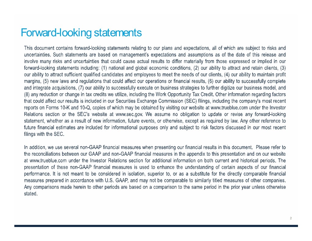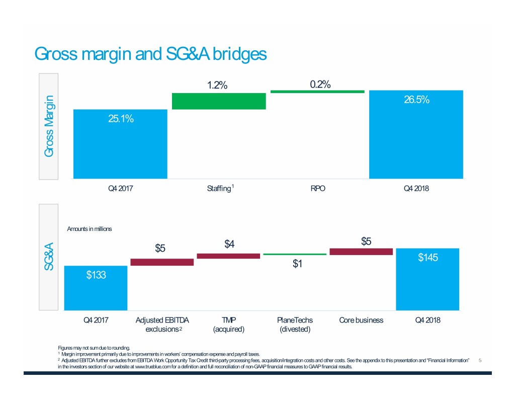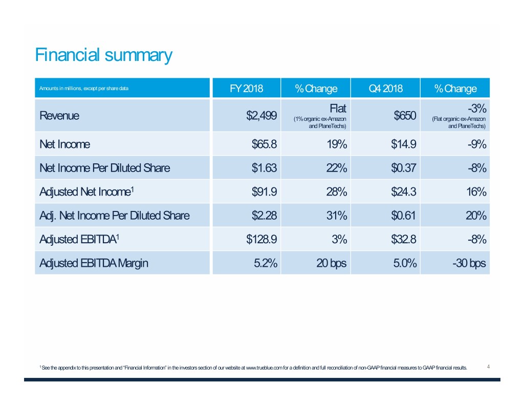 Financial summary Amounts in millions, except per share data FY 2018 % Change Q4 2018 % Change Flat -3% Revenue $2,499 (1% organic ex-Amazon $650 (Flat organic ex-Amazon and PlaneTechs) and PlaneTechs) Net Income $65.8 19% $14.9 -9% Net Income Per Diluted Share $1.63 22% $0.37 -8% Adjusted Net Income1 $91.9 28% $24.3 16% Adj. Net Income Per Diluted Share $2.28 31% $0.61 20% Adjusted EBITDA1 $128.9 3% $32.8 -8% Adjusted EBITDA Margin 5.2% 20 bps 5.0% -30 bps 1 See the appendix to this presentation and “Financial Information” in the investors section of our website at www.trueblue.com for a definition and full reconciliation of non-GAAP financial measures to GAAP financial results.