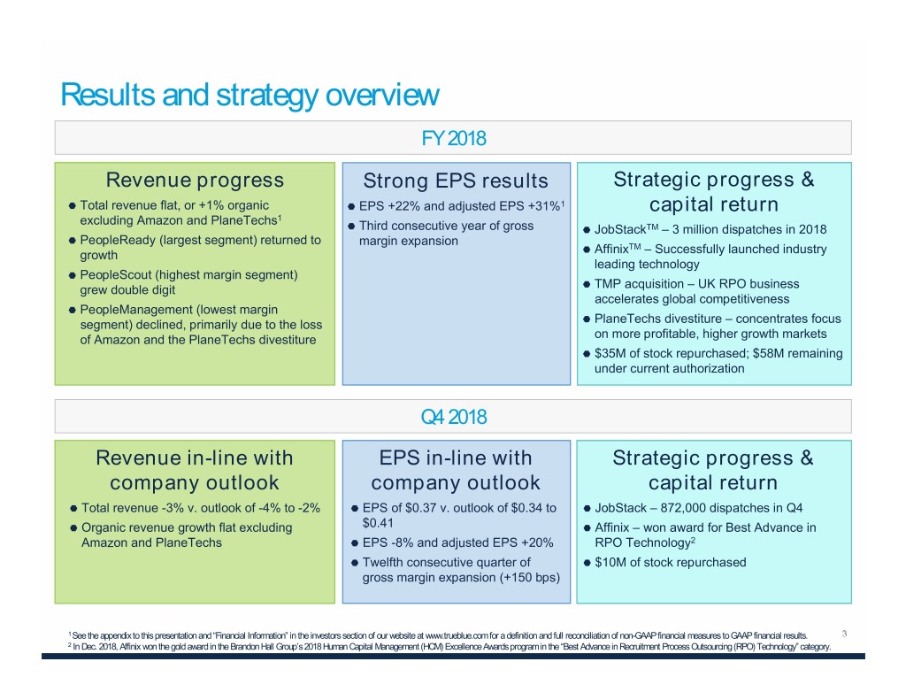Results and strategy overview FY 2018 Revenue progress Strong EPS results Strategic progress & Total revenue flat, or +1% organic EPS +22% and adjusted EPS +31%1 capital return excluding Amazon and PlaneTechs1 Third consecutive year of gross JobStackTM – 3 million dispatches in 2018 PeopleReady (largest segment) returned to margin expansion TM growth Affinix – Successfully launched industry leading technology PeopleScout (highest margin segment) grew double digit TMP acquisition – UK RPO business accelerates global competitiveness PeopleManagement (lowest margin segment) declined, primarily due to the loss PlaneTechs divestiture – concentrates focus of Amazon and the PlaneTechs divestiture on more profitable, higher growth markets $35M of stock repurchased; $58M remaining under current authorization Q4 2018 Revenue in-line with EPS in-line with Strategic progress & company outlook company outlook capital return Total revenue -3% v. outlook of -4% to -2% EPS of $0.37 v. outlook of $0.34 to JobStack – 872,000 dispatches in Q4 Organic revenue growth flat excluding $0.41 Affinix – won award for Best Advance in Amazon and PlaneTechs EPS -8% and adjusted EPS +20% RPO Technology2 Twelfth consecutive quarter of $10M of stock repurchased gross margin expansion (+150 bps) 1 See the appendix to this presentation and “Financial Information” in the investors section of our website at www.trueblue.com for a definition and full reconciliation of non-GAAP financial measures to GAAP financial results. 2 In Dec. 2018, Affinix won the gold award in the Brandon Hall Group’s 2018 Human Capital Management (HCM) Excellence Awards program in the “Best Advance in Recruitment Process Outsourcing (RPO) Technology” category.