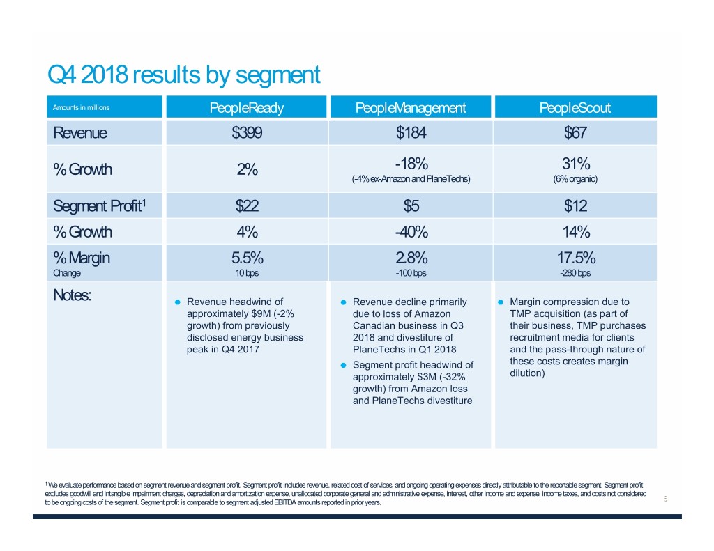 Q4 2018 results by segment Amounts in millions PeopleReady PeopleManagement PeopleScout Revenue $399 $184 $67 % Growth 2% -18% 31% (-4% ex-Amazon and PlaneTechs) (6% organic) Segment Profit1 $22 $5 $12 % Growth 4% -40% 14% % Margin 5.5% 2.8% 17.5% Change 10 bps -100 bps -280 bps Notes: Revenue headwind of Revenue decline primarily Margin compression due to approximately $9M (-2% due to loss of Amazon TMP acquisition (as part of growth) from previously Canadian business in Q3 their business, TMP purchases disclosed energy business 2018 and divestiture of recruitment media for clients peak in Q4 2017 PlaneTechs in Q1 2018 and the pass-through nature of Segment profit headwind of these costs creates margin approximately $3M (-32% dilution) growth) from Amazon loss and PlaneTechs divestiture 1 We evaluate performance based on segment revenue and segment profit. Segment profit includes revenue, related cost of services, and ongoing operating expenses directly attributable to the reportable segment. Segment profit excludes goodwill and intangible impairment charges, depreciation and amortization expense, unallocated corporate general and administrative expense, interest, other income and expense, income taxes, and costs not considered to be ongoing costs of the segment. Segment profit is comparable to segment adjusted EBITDA amounts reported in prior years.