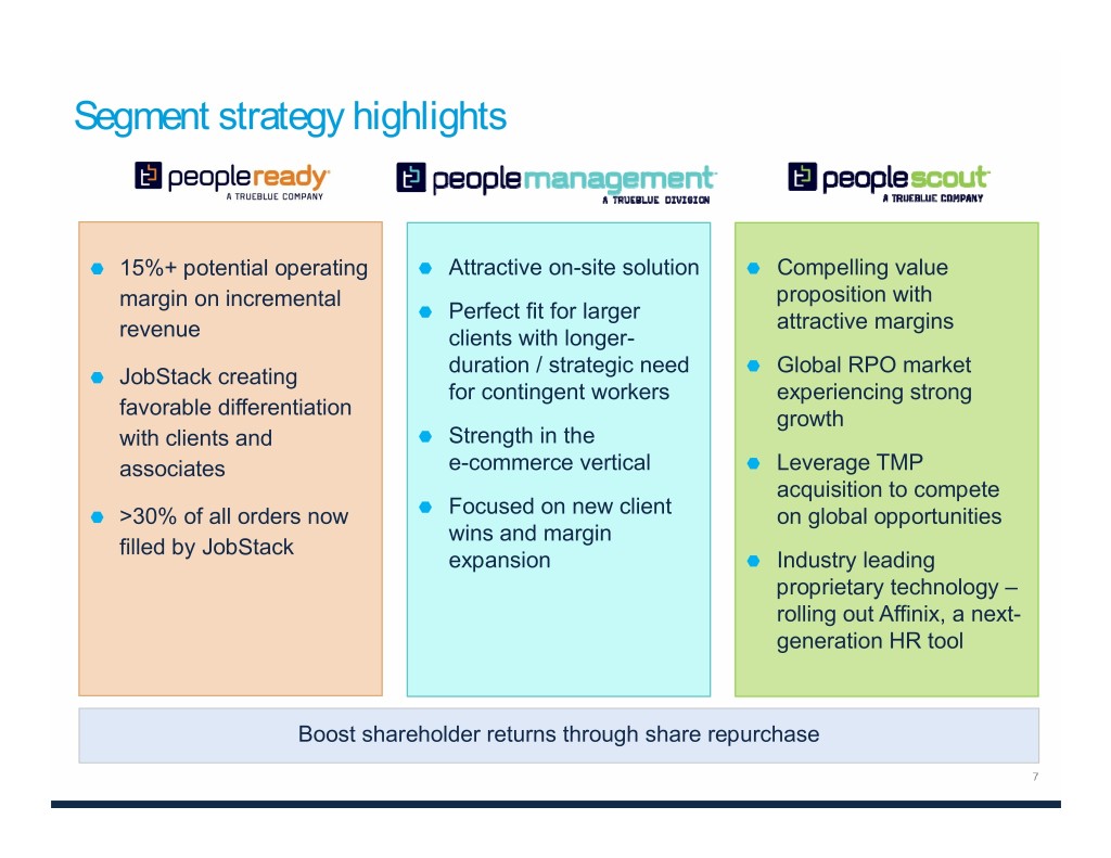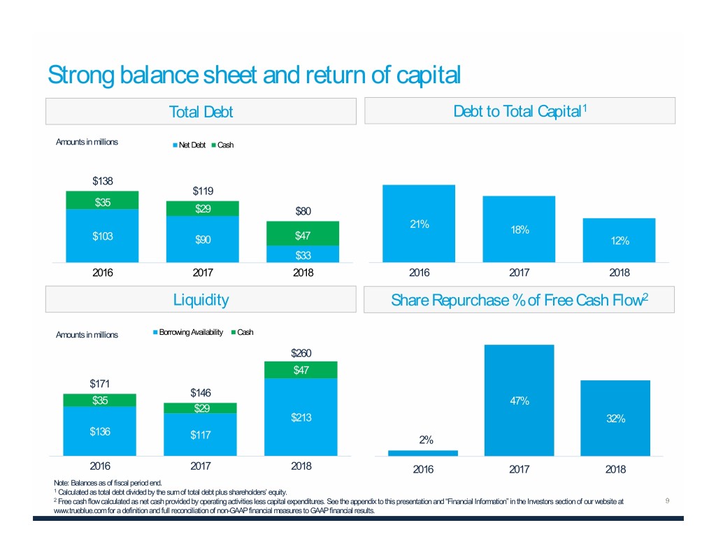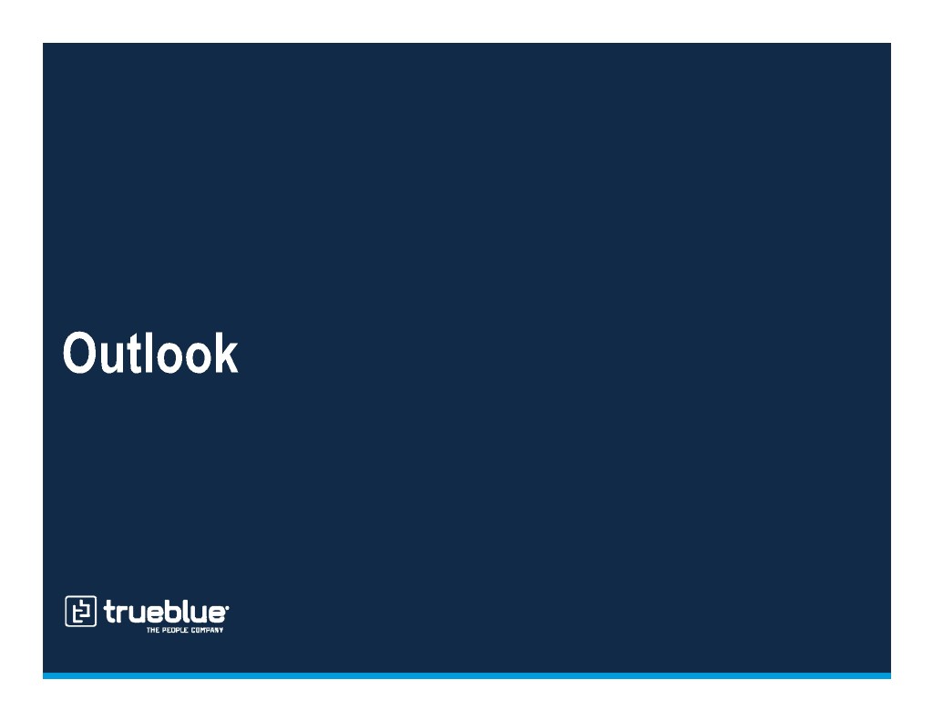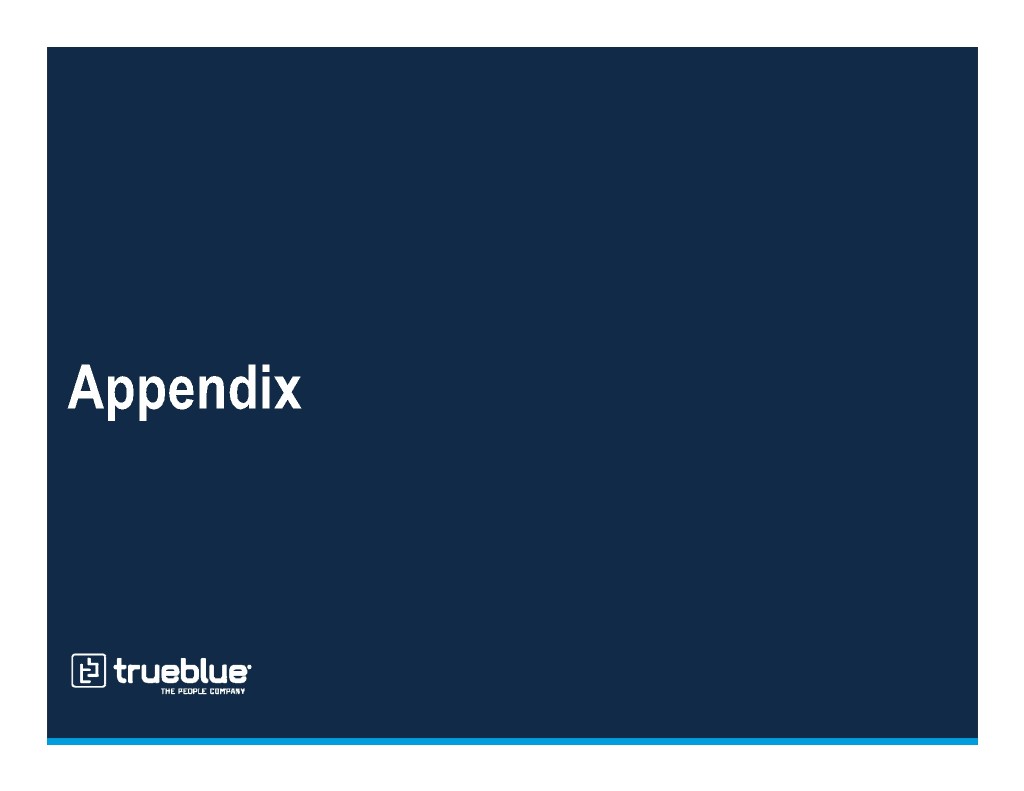 Strong balance sheet and return of capital Total Debt Debt to Total Capital1 Amounts in millions Net Debt Cash $138 $119 $35 $29 $80 21% 18% $103 $90 $47 12% $33 2016 2017 2018 2016 2017 2018 Liquidity Share Repurchase % of Free Cash Flow2 Amounts in millions Borrowing Availability Cash $260 $47 $171 $146 $35 47% $29 $213 32% $136 $117 2% 2016 2017 2018 2016 2017 2018 Note: Balances as of fiscal period end. 1 Calculated as total debt divided by the sum of total debt plus shareholders’ equity. 2 Free cash flow calculated as net cash provided by operating activities less capital expenditures. See the appendix to this presentation and “Financial Information” in the Investors section of our website at www.trueblue.com for a definition and full reconciliation of non-GAAP financial measures to GAAP financial results.