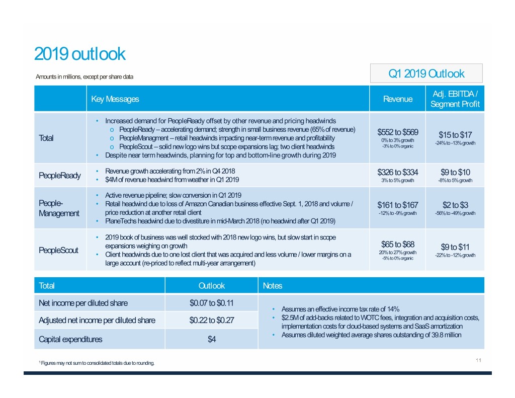 2019 outlook Amounts in millions, except per share data Q1 2019 Outlook Adj. EBITDA / Key Messages Revenue Segment Profit • Increased demand for PeopleReady offset by other revenue and pricing headwinds o PeopleReady – accelerating demand; strength in small business revenue (65% of revenue) $552 to $569 $15 to $17 Total o PeopleManagment – retail headwinds impacting near-term revenue and profitability 0% to 3% growth -24% to -13% growth o PeopleScout – solid new logo wins but scope expansions lag; two client headwinds -3% to 0% organic • Despite near term headwinds, planning for top and bottom-line growth during 2019 • Revenue growth accelerating from 2% in Q4 2018 PeopleReady $326 to $334 $9 to $10 • $4M of revenue headwind from weather in Q1 2019 3% to 5% growth -8% to 5% growth • Active revenue pipeline; slow conversion in Q1 2019 People- • Retail headwind due to loss of Amazon Canadian business effective Sept. 1, 2018 and volume / $161 to $167 $2 to $3 Management price reduction at another retail client -12% to -9% growth -56% to -49% growth • PlaneTechs headwind due to divestiture in mid-March 2018 (no headwind after Q1 2019) • 2019 book of business was well stocked with 2018 new logo wins, but slow start in scope expansions weighing on growth $65 to $68 $9 to $11 PeopleScout 20% to 27% growth • Client headwinds due to one lost client that was acquired and less volume / lower margins on a -22% to -12% growth -5% to 0% organic large account (re-priced to reflect multi-year arrangement) Total Outlook Notes Net income per diluted share $0.07 to $0.11 • Assumes an effective income tax rate of 14% Adjusted net income per diluted share $0.22 to $0.27 • $2.5M of add-backs related to WOTC fees, integration and acquisition costs, implementation costs for cloud-based systems and SaaS amortization • Assumes diluted weighted average shares outstanding of 39.8 million Capital expenditures $4 1 Figures may not sum to consolidated totals due to rounding.