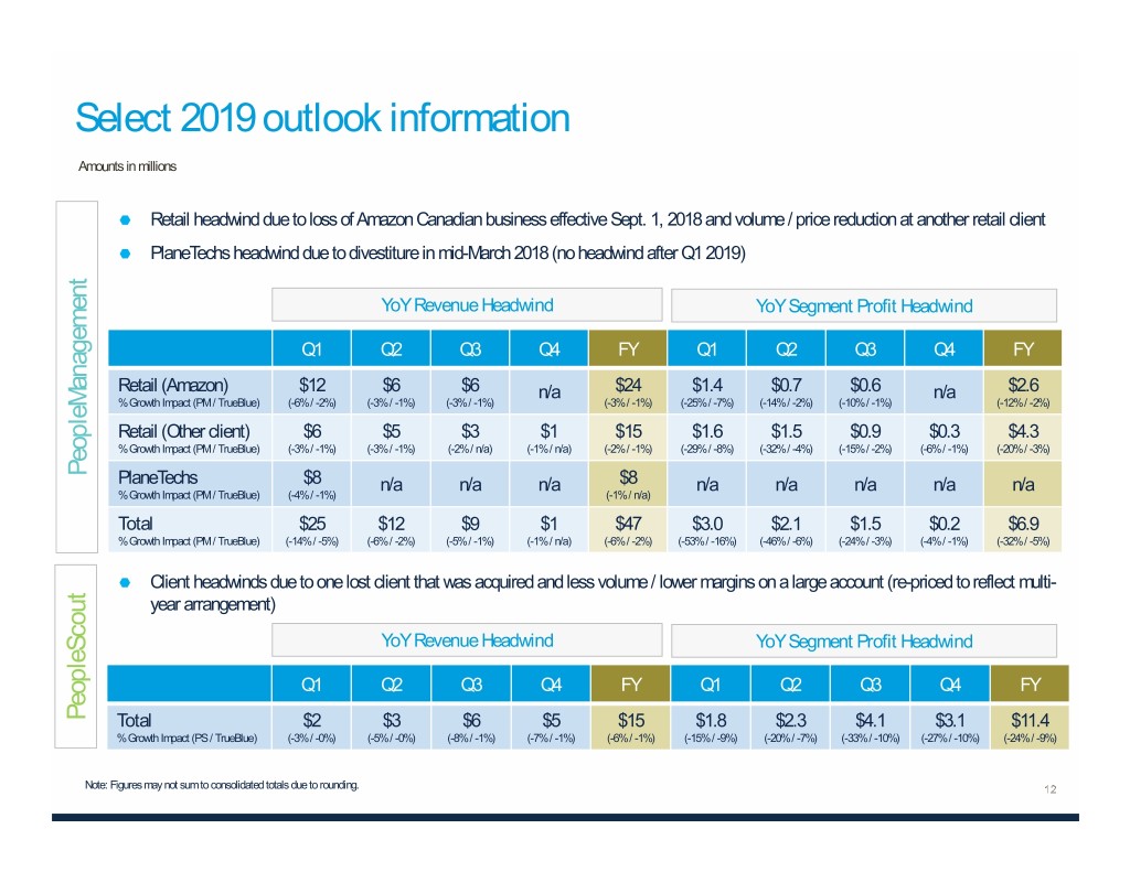 Select 2019 outlook information Amounts in millions Retail headwind due to loss of Amazon Canadian business effective Sept. 1, 2018 and volume / price reduction at another retail client PlaneTechs headwind due to divestiture in mid-March 2018 (no headwind after Q1 2019) YoY Revenue Headwind YoY Segment Profit Headwind Q1 Q2 Q3 Q4 FY Q1 Q2 Q3 Q4 FY Retail (Amazon) $12 $6 $6 n/a $24 $1.4 $0.7 $0.6 n/a $2.6 % Growth Impact (PM / TrueBlue) (-6% / -2%) (-3% / -1%) (-3% / -1%) (-3% / -1%) (-25% / -7%) (-14% / -2%) (-10% / -1%) (-12% / -2%) Retail (Other client) $6 $5 $3 $1 $15 $1.6 $1.5 $0.9 $0.3 $4.3 % Growth Impact (PM / TrueBlue) (-3% / -1%) (-3% / -1%) (-2% / n/a) (-1% / n/a) (-2% / -1%) (-29% / -8%) (-32% / -4%) (-15% / -2%) (-6% / -1%) (-20% / -3%) PeopleManagement PlaneTechs $8 n/a n/a n/a $8 n/a n/a n/a n/a n/a % Growth Impact (PM / TrueBlue) (-4% / -1%) (-1% / n/a) Total $25 $12 $9 $1 $47 $3.0 $2.1 $1.5 $0.2 $6.9 % Growth Impact (PM / TrueBlue) (-14% / -5%) (-6% / -2%) (-5% / -1%) (-1% / n/a) (-6% / -2%) (-53% / -16%) (-46% / -6%) (-24% / -3%) (-4% / -1%) (-32% / -5%) Client headwinds due to one lost client that was acquired and less volume / lower margins on a large account (re-priced to reflect multi- year arrangement) YoY Revenue Headwind YoY Segment Profit Headwind Q1 Q2 Q3 Q4 FY Q1 Q2 Q3 Q4 FY PeopleScout Total $2 $3 $6 $5 $15 $1.8 $2.3 $4.1 $3.1 $11.4 % Growth Impact (PS / TrueBlue) (-3% / -0%) (-5% / -0%) (-8% / -1%) (-7% / -1%) (-6% / -1%) (-15% / -9%) (-20% / -7%) (-33% / -10%) (-27% / -10%) (-24% / -9%) Note: Figures may not sum to consolidated totals due to rounding.