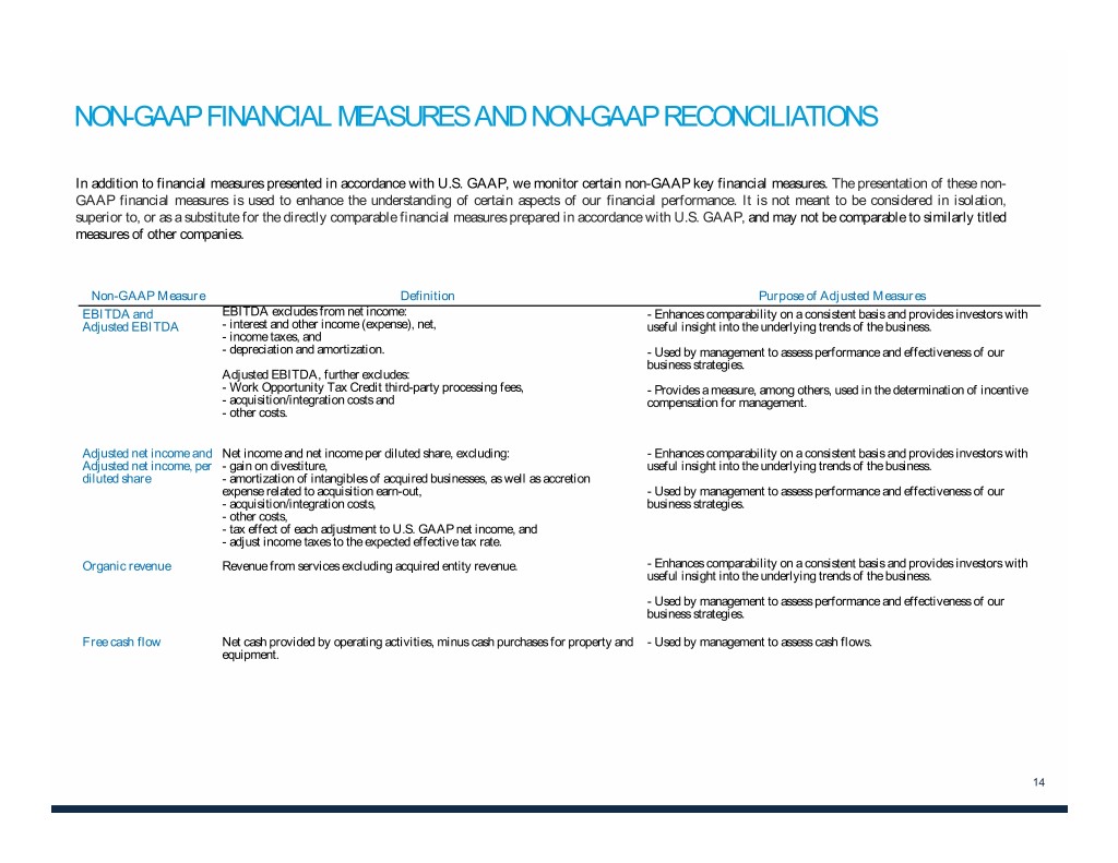 NON-GAAP FINANCIAL MEASURES AND NON-GAAP RECONCILIATIONS In addition to financial measures presented in accordance with U.S. GAAP, we monitor certain non-GAAP key financial measures. The presentation of these non- GAAP financial measures is used to enhance the understanding of certain aspects of our financial performance. It is not meant to be considered in isolation, superior to, or as a substitute for the directly comparable financial measures prepared in accordance with U.S. GAAP, and may not be comparable to similarly titled measures of other companies. Non-GAAP Measure Definition Purpose of Adjusted Measures EBITDA and EBITDA excludes from net income: - Enhances comparability on a consistent basis and provides investors with Adjusted EBITDA - interest and other income (expense), net, useful insight into the underlying trends of the business. - income taxes, and - depreciation and amortization. - Used by management to assess performance and effectiveness of our business strategies. Adjusted EBITDA, further excludes: - Work Opportunity Tax Credit third-party processing fees, - Provides a measure, among others, used in the determination of incentive - acquisition/integration costs and compensation for management. - other costs. Adjusted net income and Net income and net income per diluted share, excluding: - Enhances comparability on a consistent basis and provides investors with Adjusted net income, per - gain on divestiture, useful insight into the underlying trends of the business. diluted share - amortization of intangibles of acquired businesses, as well as accretion expense related to acquisition earn-out, - Used by management to assess performance and effectiveness of our - acquisition/integration costs, business strategies. - other costs, - tax effect of each adjustment to U.S. GAAP net income, and - adjust income taxes to the expected effective tax rate. Organic revenue Revenue from services excluding acquired entity revenue. - Enhances comparability on a consistent basis and provides investors with useful insight into the underlying trends of the business. - Used by management to assess performance and effectiveness of our business strategies. Free cash flow Net cash provided by operating activities, minus cash purchases for property and - Used by management to assess cash flows. equipment. 14
