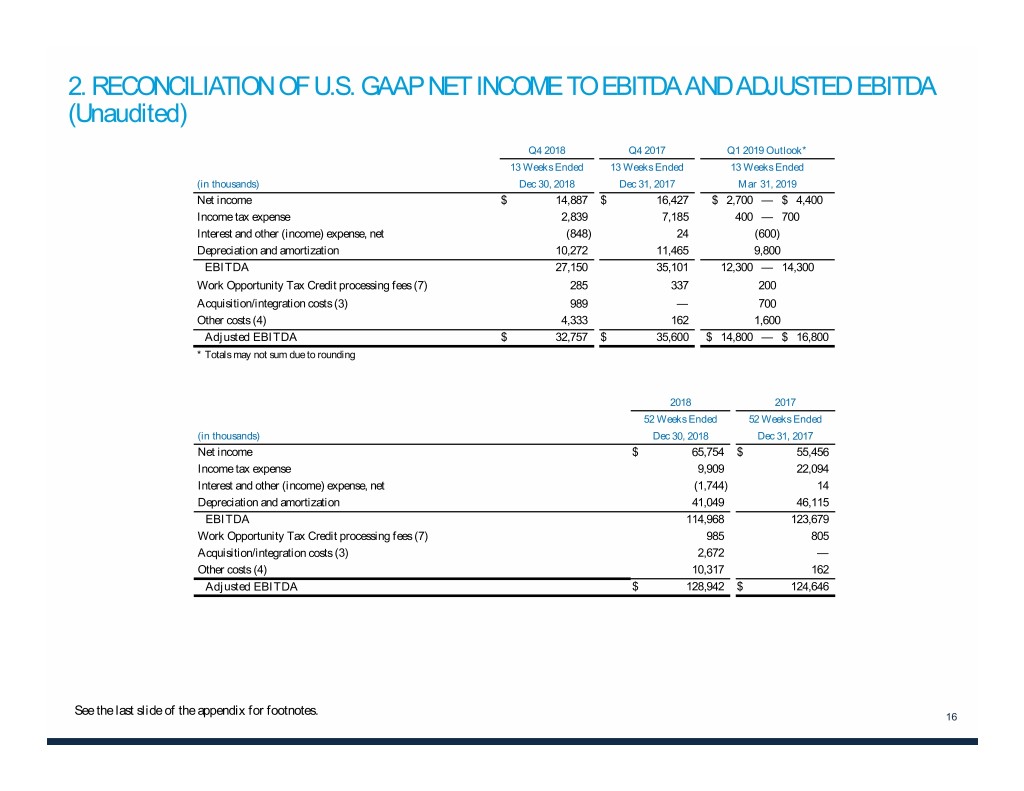 1. RECONCILIATION OF U.S. GAAP NET INCOME TO ADJUSTED NET INCOME AND ADJUSTED NET INCOME, PER DILUTED SHARE (Unaudited) Q4 2018 Q4 2017 Q1 2019 Outlook* 13 Weeks Ended 13 Weeks Ended 13 Weeks Ended (in thousands, except for per share data) Dec 30, 2018 Dec 31, 2017 Mar 31, 2019 Net income $ 14,887 $ 16,427 $ 2,700 — $ 4,400 Amortization of intangible assets of acquired businesses (2) 5,162 5,331 5,000 Acquisition/integration costs (3) 989 — 700 Other costs (4) 4,333 162 1,600 Tax effect of adjustments to net income (5) (1,468) (1,538) (1,000) Adjustment of income taxes to normalized effective rate (6) 357 574 — Adjusted net income $ 24,260 $ 20,956 $ 8,900 — $ 10,600 * Totals may not sum due to rounding Adjusted net income, per diluted share $ 0.61 $ 0.51 $ 0.22 — $ 0.27 Diluted weighted average shares outstanding 39,926 40,856 39,800 2018 2017 52 Weeks Ended 52 Weeks Ended (in thousands, except for per share data) Dec 30, 2018 Dec 31, 2017 Net income $ 65,754 $ 55,456 Gain on divestiture (1) (718) — Amortization of intangible assets of acquired businesses (2) 20,750 22,290 Acquisition/integration costs (3) 2,672 — Other costs (4) 10,317 162 Tax effect of adjustments to net income (5) (5,074) (6,287) Adjustment of income taxes to normalized effective rate (6) (1,843) 380 Adjusted net income $ 91,858 $ 72,001 Adjusted net income, per diluted share $ 2.28 $1.74 Diluted weighted average shares outstanding 40,275 41,441 See the last slide of the appendix for footnotes. 15