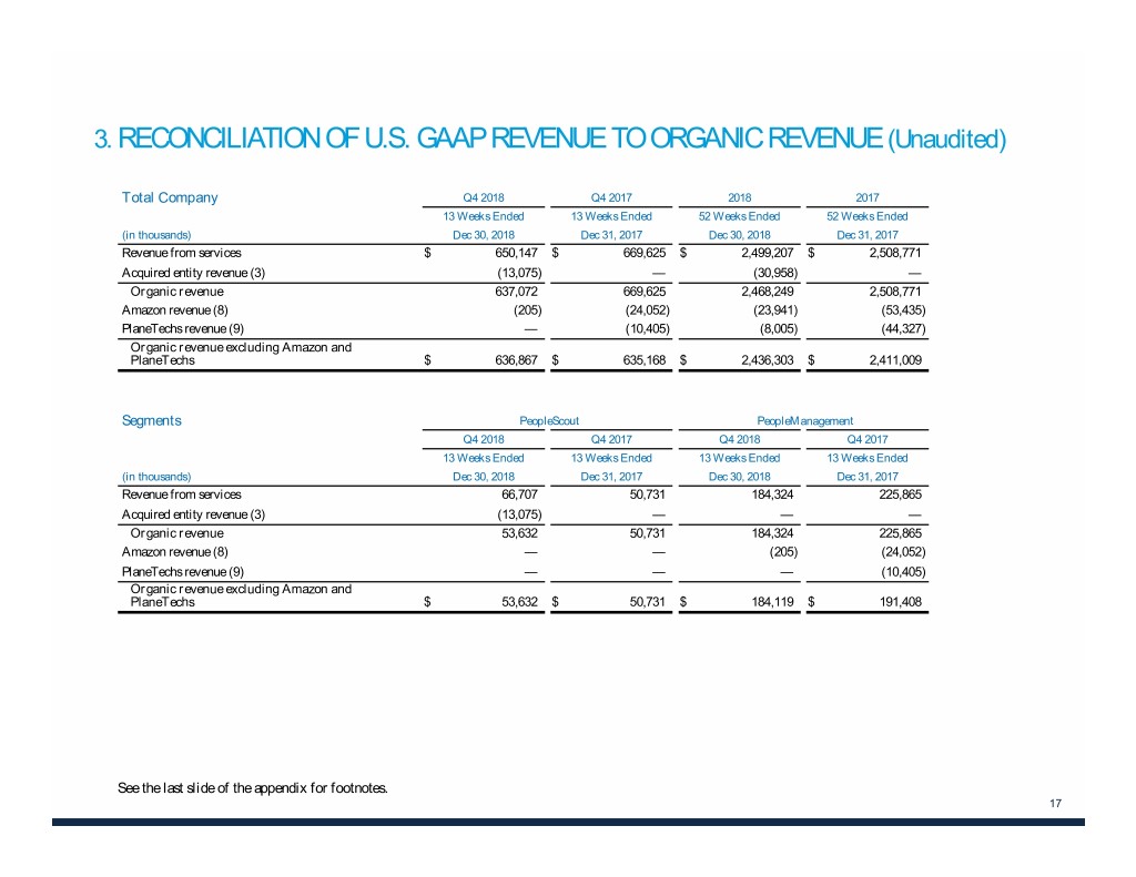 3. RECONCILIATION OF U.S. GAAP REVENUE TO ORGANIC REVENUE (Unaudited) Total Company Q4 2018 Q4 2017 2018 2017 13 Weeks Ended 13 Weeks Ended 52 Weeks Ended 52 Weeks Ended (in thousands) Dec 30, 2018 Dec 31, 2017 Dec 30, 2018 Dec 31, 2017 Revenue from services $ 650,147 $ 669,625 $ 2,499,207 $ 2,508,771 Acquired entity revenue (3) (13,075) — (30,958) — Organic revenue 637,072 669,625 2,468,249 2,508,771 Amazon revenue (8) (205) (24,052) (23,941) (53,435) PlaneTechs revenue (9) — (10,405) (8,005) (44,327) Organic revenue excluding Amazon and PlaneTechs $ 636,867 $ 635,168 $ 2,436,303 $ 2,411,009 Segments PeopleScout PeopleManagement Q4 2018 Q4 2017 Q4 2018 Q4 2017 13 Weeks Ended 13 Weeks Ended 13 Weeks Ended 13 Weeks Ended (in thousands) Dec 30, 2018 Dec 31, 2017 Dec 30, 2018 Dec 31, 2017 Revenue from services 66,707 50,731 184,324 225,865 Acquired entity revenue (3) (13,075) — — — Organic revenue 53,632 50,731 184,324 225,865 Amazon revenue (8) — — (205) (24,052) PlaneTechs revenue (9) — — — (10,405) Organic revenue excluding Amazon and PlaneTechs $ 53,632 $ 50,731 $ 184,119 $ 191,408 See the last slide of the appendix for footnotes. 17