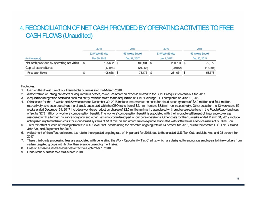 4. RECONCILIATION OF NET CASH PROVIDED BY OPERATING ACTIVITIES TO FREE CASH FLOWS (Unaudited) 2018 2017 2016 2015 52 Weeks Ended 52 Weeks Ended 53 Weeks Ended 52 Weeks Ended (in thousands) Dec 30, 2018 Dec 31, 2017 Jan 1, 2017 Dec 25, 2015 Net cash provided by operating activities $ 125,692 $ 100,134 $ 260,703 $ 72,072 Capital expenditures (17,054) (21,958) (29,042) (18,394) Free cash flows $ 108,638 $ 78,176 $ 231,661 $ 53,678 Footnotes: 1. Gain on the divestiture of our PlaneTechs business sold mid-March 2018. 2. Amortization of intangible assets of acquired businesses, as well as accretion expense related to the SIMOS acquisition earn-out for 2017. 3. Acquisition/integration costs and acquired entity revenue relate to the acquisition of TMP Holdings LTD completed on June 12, 2018. 4. Other costs for the 13 weeks and 52 weeks ended December 30, 2018 include implementation costs for cloud-based systems of $2.2 million and $6.7 million, respectively, and accelerated vesting of stock associated with the CEO transition of $2.1 million and $3.6 million, respectively. Other costs for the 13 weeks and 52 weeks ended December 31, 2017 include a workforce reduction charge of $2.5 million primarily associated with employee reductions in the PeopleReady business, offset by $2.3 million of workers' compensation benefit. The workers' compensation benefit is associated with the favorable settlement of insurance coverage associated with a former insurance company and other items not considered part of our core operations. Other costs for the 13 weeks ended March 31, 2019 include anticipated implementation costs for cloud-based systems of $1.3 million and amortization expense associated with software as a service assets of $0.3 million. 5. Total tax effect of each of the adjustments to U.S. GAAP net income using the expected ongoing rate of 14 percent for 2018, due to the enacted U.S. Tax Cuts and Jobs Act, and 28 percent for 2017. 6. Adjustment of the effective income tax rate to the expected ongoing rate of 14 percent for 2018, due to the enacted U.S. Tax Cuts and Jobs Act, and 28 percent for 2017. 7. These third-party processing fees are associated with generating the Work Opportunity Tax Credits, which are designed to encourage employers to hire workers from certain targeted groups with higher than average unemployment rates. 8. Loss of Amazon Canadian business effective September 1, 2018. 9. PlaneTechs business sold mid-March 2018. 18
