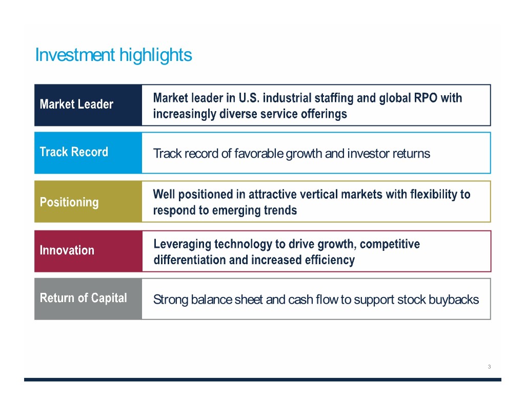 Segment strategy highlights 15%+ potential operating Attractive on-site solution Compelling value margin on incremental proposition with Perfect fit for larger attractive margins revenue clients with longer- duration / strategic need Global RPO market JobStackTM creating for contingent workers experiencing strong favorable differentiation growth with clients and Strength in the associates e-commerce vertical Leverage TMP acquisition to compete Focused on new client >30% of all orders now on global opportunities wins and margin filled by JobStack expansion Industry leading proprietary technology – rolling out AffinixTM, a next-generation HR tool Boost shareholder returns through share repurchase