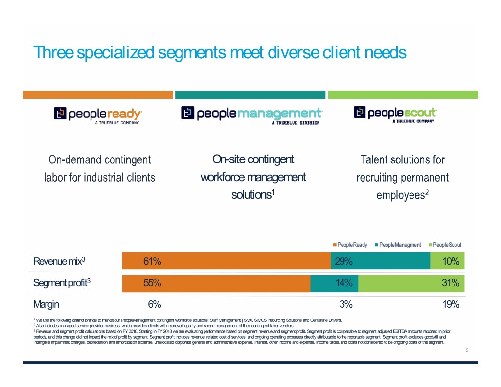 Three specialized segments meet diverse client needs On-site contingent workforce management solutions1 Revenue mix3 61% 29% 10% Segment profit3 55% 14% 31% Margin 6% 3% 19% 1 We use the following distinct brands to market our PeopleManagement contingent workforce solutions: Staff Management | SMX, SIMOS Insourcing Solutions and Centerline Drivers. 2 Also includes managed service provider business, which provides clients with improved quality and spend management of their contingent labor vendors. 3 Revenue and segment profit calculations based on FY 2018. Starting in FY 2018 we are evaluating performance based on segment revenue and segment profit. Segment profit is comparable to segment adjusted EBITDA amounts reported in prior periods, and this change did not impact the mix of profit by segment. Segment profit includes revenue, related cost of services, and ongoing operating expenses directly attributable to the reportable segment. Segment profit excludes goodwill and intangible impairment charges, depreciation and amortization expense, unallocated corporate general and administrative expense, interest, other income and expense, income taxes, and costs not considered to be ongoing costs of the segment.