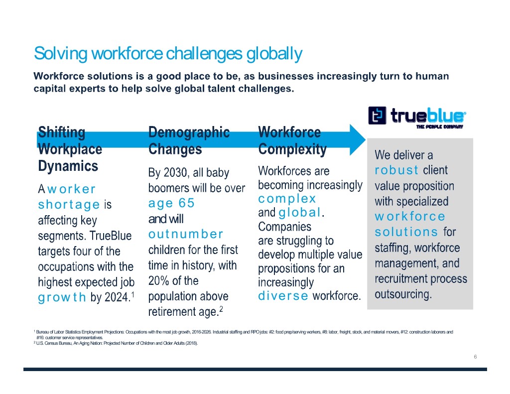 TrueBlue at a glance 151,000 730,000 #1 Clients served annually People connected to One of the largest U.S. industrial Global 1 with strong diversity work during 2018 staffing providers RPO provider2 2013-2018 2013-2018 Average Return Revenue CAGR on Equity3 8% 16% $2.5B Growth Return 2018 Revenue PeopleScout named a Leader and HRO Today magazine repeatedly Thousands of veterans hired each Recognized for breakthrough board Star Performer by Everest Group for recognizes PeopleScout as a global year via internal programs as well as practices that promote greater service delivery, technology and market leader Hiring Our Heroes and Wounded diversity and inclusion buyer satisfaction Warriors 1 No single client accounted for more than 3% of total revenue for FY 2018. 2 Source: Everest Group. Overall recruitment process outsourcing rankings by annual number of hires (2018). 3 Calculated as adjusted net income divided by average shareholders’ equity over the prior four quarters. 4