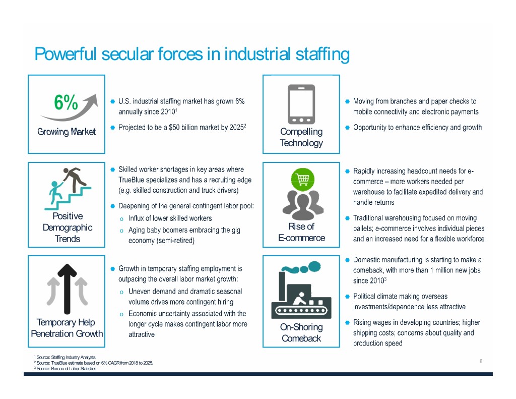 Powerful secular forces in industrial staffing 6% Growing Market Compelling Technology Positive o Demographic o Rise of Trends E-commerce o o Temporary Help On-Shoring Penetration Growth Comeback 1 Source: Staffing Industry Analysts. 2 Source: TrueBlue estimate based on 6% CAGR from 2018 to 2025. 8 3 Source: Bureau of Labor Statistics.