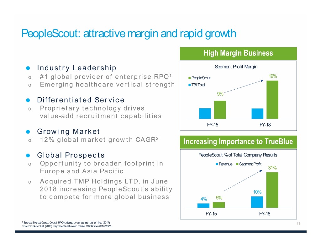 PeopleScout: attractive margin and rapid growth Industry Leadership Segment Profit Margin 1 o #1 global provider of enterprise RPO PeopleScout 19% o Emerging healthcare vertical strength TBI Total 9% Differentiated Service o Proprietary technology drives value-add recruitment capabilities FY-15 FY-18 Growing Market o 12% global market growth CAGR2 Global Prospects PeopleScout % of Total Company Results o Opportunity to broaden footprint in Revenue Segment Profit 31% Europe and Asia Pacific o Acquired TMP Holdings LTD, in June 2018 increasing PeopleScout’s ability 10% to compete for more global business 4% 5% FY-15 FY-18 1 Source: Everest Group. Overall RPO rankings by annual number of hires (2017). 2 Source: NelsonHall (2018). Represents estimated market CAGR from 2017-2022.