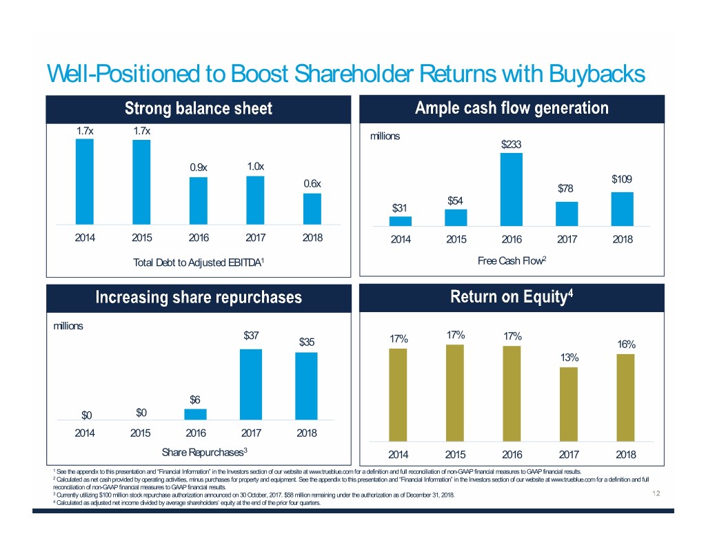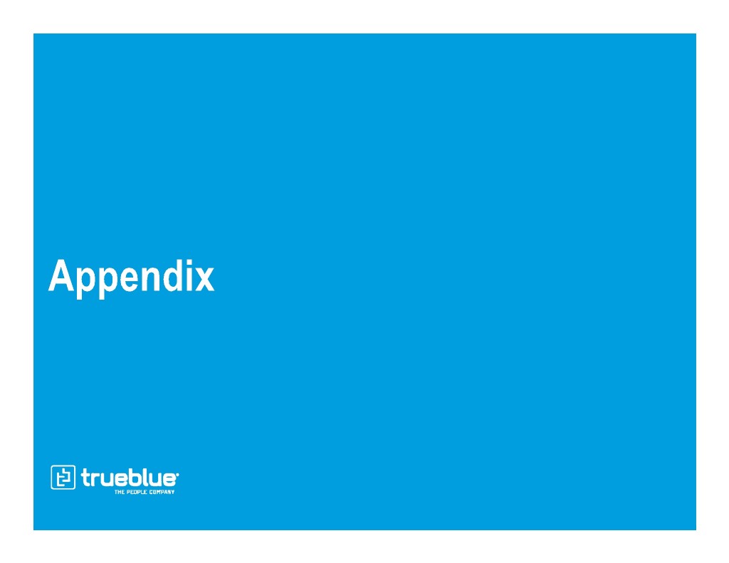 Well-Positioned to Boost Shareholder Returns with Buybacks 1.7x 1.7x millions $233 0.9x 1.0x $109 0.6x $78 $54 $31 2014 2015 2016 2017 2018 2014 2015 2016 2017 2018 Total Debt to Adjusted EBITDA1 Free Cash Flow2 millions $37 17% 17% 17% $35 16% 13% $6 $0 $0 2014 2015 2016 2017 2018 Share Repurchases3 2014 2015 2016 2017 2018 1 See the appendix to this presentation and “Financial Information” in the Investors section of our website at www.trueblue.com for a definition and full reconciliation of non-GAAP financial measures to GAAP financial results. 2 Calculated as net cash provided by operating activities, minus purchases for property and equipment. See the appendix to this presentation and “Financial Information” in the Investors section of our website at www.trueblue.com for a definition and full reconciliation of non-GAAP financial measures to GAAP financial results. 3 Currently utilizing $100 million stock repurchase authorization announced on 30 October, 2017. $58 million remaining under the authorization as of December 31, 2018. 4 Calculated as adjusted net income divided by average shareholders’ equity at the end of the prior four quarters.