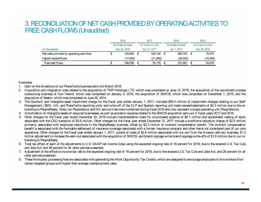 3. RECONCILIATION OF NET CASH PROVIDED BY OPERATING ACTIVITIES TO FREE CASH FLOWS (Unaudited) 2018 2017 2016 2015 52 Weeks Ended 52 Weeks Ended 53 Weeks Ended 52 Weeks Ended (in thousands) Dec 30, 2018 Dec 31, 2017 Jan 1, 2017 Dec 25, 2015 Net cash provided by operating activities $ 125,692 $ 100,134 $ 260,703 $ 72,072 Capital expenditures (17,054) (21,958) (29,042) (18,394) Free cash flows $ 108,638 $ 78,176 $ 231,661 $ 53,678 Footnotes: 1. Gain on the divestiture of our PlaneTechs business sold mid-March 2018. 2. Acquisition and integration costs related to the acquisition of TMP Holdings LTD, which was completed on June 12, 2018, the acquisition of the recruitment process outsourcing business of Aon Hewitt, which was completed on January 4, 2016, the acquisition of SIMOS, which was completed on December 1, 2015, and the acquisition of Seaton, which was completed on June 30, 2014. 3. The Goodwill and intangible asset impairment charge for the fiscal year ended January 1, 2017, included $99.3 million of impairment charges relating to our Staff Management | SMX, hrX, and PlaneTechs reporting units, and write-off of the CLP and Spartan reporting unit trade names/trademarks of $4.3 million due to the re- branding to PeopleReady. Note, our PeopleScout and hrX service lines were combined during fiscal 2016 and now represent a single operating unit (PeopleScout). 4. Amortization of intangible assets of acquired businesses, as well as accretion expense related to the SIMOS acquisition earn-out in fiscal years 2017 and 2016. 5. Other charges for the fiscal year ended December 30, 2018 include implementation costs for cloud-based systems of $6.7 million and accelerated vesting of stock associated with the CEO transition of $3.6 million. Other charges for the fiscal year ended December 31, 2017 include a workforce reduction charge of $2.5 million primarily associated with employee reductions in the PeopleReady business, offset by $2.3 million of workers' compensation benefit. The workers' compensation benefit is associated with the favorable settlement of insurance coverage associated with a former insurance company and other items not considered part of our core operations. Other charges for the fiscal year ended January 1, 2017, consist of costs of $2.6 million associated with our exit from the Amazon delivery business, $1.3 million adjustment to increase the earn-out associated with the acquisition of SIMOS, and branch signage write branch signage write-offs of $1.6 million due to our re- branding to PeopleReady. 6. Total tax effect of each of the adjustments to U.S. GAAP net income (loss) using the expected ongoing rate of 16 percent for 2018, due to the enacted U.S.TaxCuts and Jobs Act, and 28 percent for all other periods presented. 7. Adjustment of the effective income tax rate to the expected ongoing rate of 16 percent for 2018, due to the enacted U.S. Tax Cuts and Jobs Act, and 28 percent for all other periods presented. 8. These third-party processing fees are associated with generating the Work Opportunity Tax Credits, which are designed to encourage employers to hire workers from certain targeted groups with higher than average unemployment rates. 16