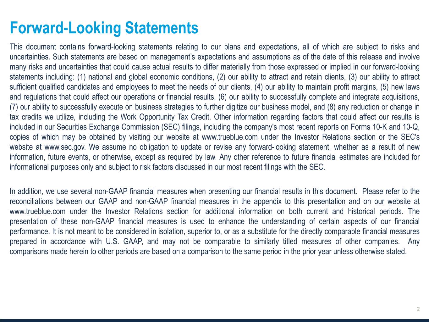 NON-GAAP FINANCIAL MEASURES AND NON-GAAP RECONCILIATIONS In addition to financial measures presented in accordance with U.S. GAAP, we monitor certain non-GAAP key financial measures. The presentation of these non-GAAP financial measures is used to enhance the understanding of certain aspects of our financial performance. It is not meant to be considered in isolation, superior to, or as a substitute for the directly comparable financial measures prepared in accordance with U.S. GAAP, and may not be comparable to similarly titled measures of other companies. Non-GAAP Measure Definition Purpose of Adjusted Measures EBITDA and EBITDA excludes from net income (loss): - Enhances comparability on a consistent basis and provides Adjusted EBITDA - interest and other income (expense), net, investors with useful insight into the underlying trends of the - income taxes, and business. - depreciation and amortization. - Used by management to assess performance and effectiveness of Adjusted EBITDA, further excludes: our business strategies. - acquisition/integration costs, - goodwill and intangible asset impairment charge, and - Provides a measure, among others, used in the determination of - Work Opportunity Tax Credit third-party processing fees and incentive compensation for management. - other costs. Adjusted net income Net income (loss) and net income (loss) per diluted share, excluding: - Enhances comparability on a consistent basis and provides and Adjusted net - adjustment to the gain on divestiture, investors with useful insight into the underlying trends of the income, per diluted - acquisition/integration costs, business. share - goodwill and intangible asset impairment charge, - amortization of intangibles of acquired businesses, as well as accretion expense - Used by management to assess performance and effectiveness of related to acquisition earn-out, our business strategies. - other costs, - tax effect of each adjustment to U.S. GAAP net income (loss), and - adjusted income taxes to the expected effective tax rate. Free cash flow Net cash provided by operating activities, minus cash purchases for property and - Used by management to assess cash flows. equipment. 14