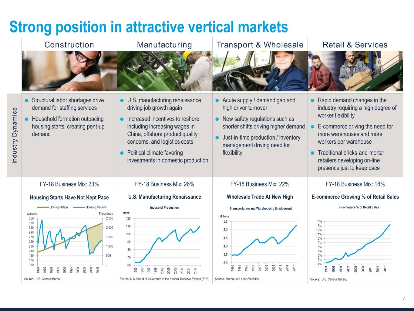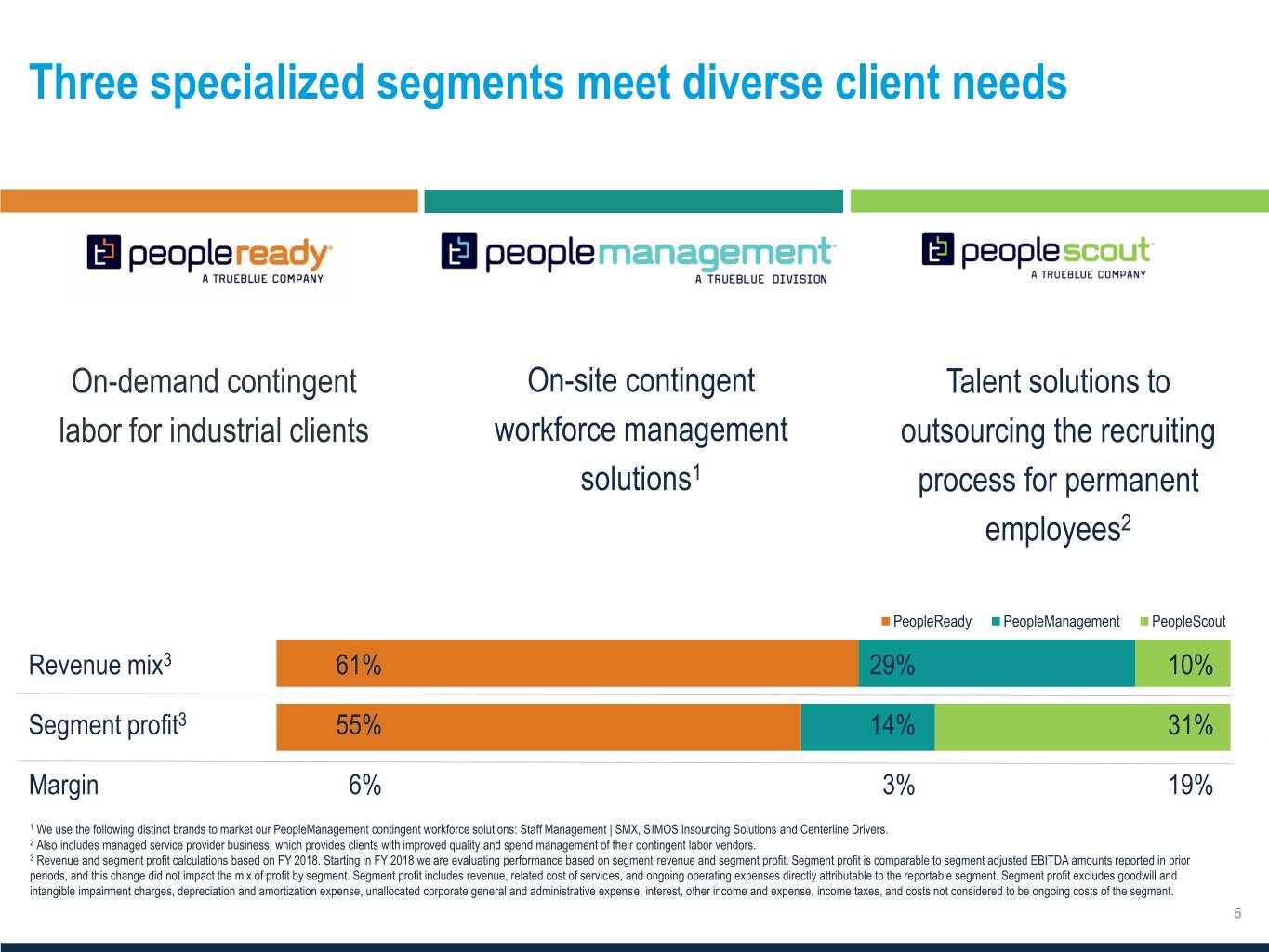 Three specialized segments meet diverse client needs On-site contingent Talent solutions to workforce management outsourcing the recruiting solutions1 process for permanent employees2 PeopleReady PeopleManagement PeopleScout Revenue mix3 61% 29% 10% Segment profit3 55% 14% 31% Margin 6% 3% 19% 1 We use the following distinct brands to market our PeopleManagement contingent workforce solutions: Staff Management | SMX, SIMOS Insourcing Solutions and Centerline Drivers. 2 Also includes managed service provider business, which provides clients with improved quality and spend management of their contingent labor vendors. 3 Revenue and segment profit calculations based on FY 2018. Starting in FY 2018 we are evaluating performance based on segment revenue and segment profit. Segment profit is comparable to segment adjusted EBITDA amounts reported in prior periods, and this change did not impact the mix of profit by segment. Segment profit includes revenue, related cost of services, and ongoing operating expenses directly attributable to the reportable segment. Segment profit excludes goodwill and intangible impairment charges, depreciation and amortization expense, unallocated corporate general and administrative expense, interest, other income and expense, income taxes, and costs not considered to be ongoing costs of the segment.