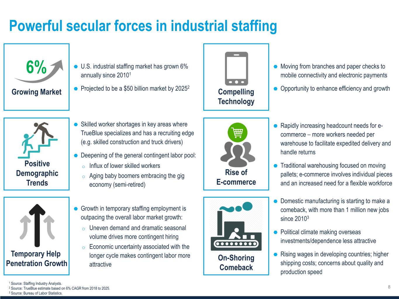 Powerful secular forces in industrial staffing 6% Growing Market Compelling Technology Positive o Demographic o Rise of Trends E-commerce o o Temporary Help On-Shoring Penetration Growth Comeback 1 Source: Staffing Industry Analysts. 2 Source: TrueBlue estimate based on 6% CAGR from 2018 to 2025. 8 3 Source: Bureau of Labor Statistics.