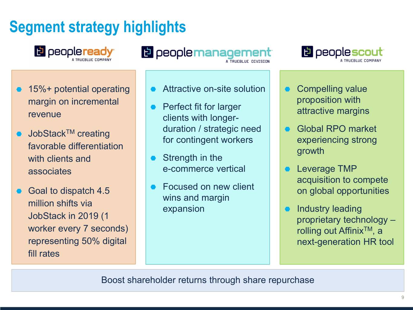 Segment strategy highlights 15%+ potential operating Attractive on-site solution Compelling value margin on incremental proposition with Perfect fit for larger attractive margins revenue clients with longer- duration / strategic need Global RPO market JobStackTM creating for contingent workers experiencing strong favorable differentiation growth with clients and Strength in the associates e-commerce vertical Leverage TMP acquisition to compete Focused on new client Goal to dispatch 4.5 on global opportunities wins and margin million shifts via expansion Industry leading JobStack in 2019 (1 proprietary technology – worker every 7 seconds) rolling out AffinixTM, a representing 50% digital next-generation HR tool fill rates Boost shareholder returns through share repurchase