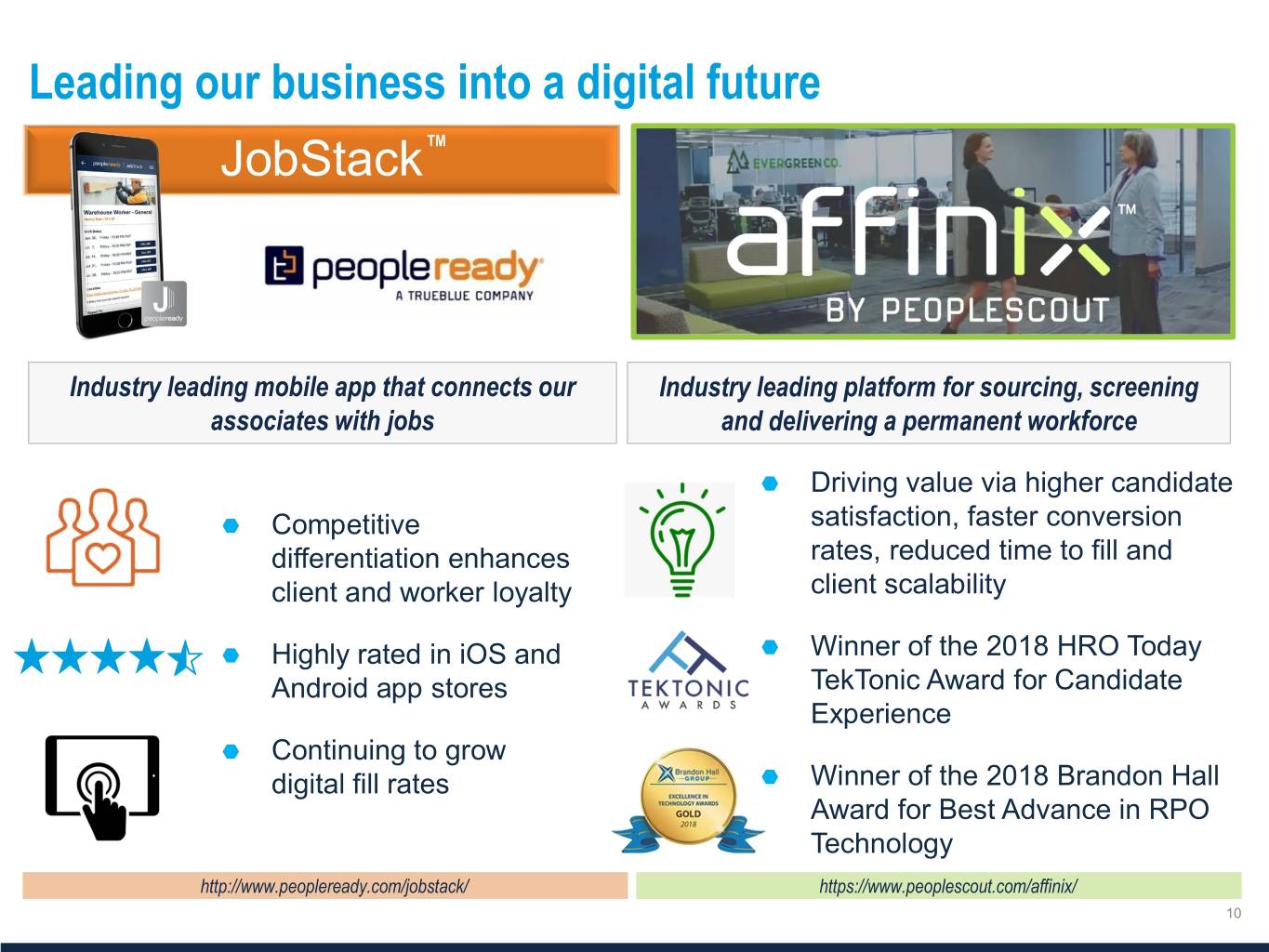 Leading our business into a digital future JobStack TM Industry leading mobile app that connects our Industry leading platform for sourcing, screening associates with jobs and delivering a permanent workforce Driving value via higher candidate Competitive satisfaction, faster conversion differentiation enhances rates, reduced time to fill and client and worker loyalty client scalability Highly rated in iOS and Winner of the 2018 HRO Today Android app stores TekTonic Award for Candidate Experience Continuing to grow digital fill rates Winner of the 2018 Brandon Hall Award for Best Advance in RPO Technology