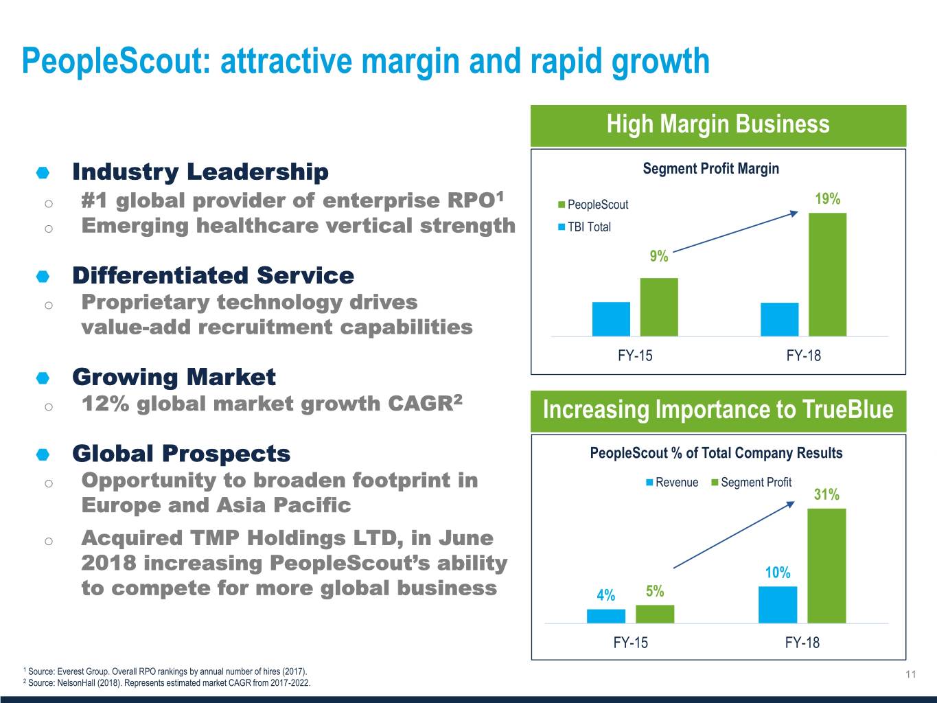 PeopleScout: attractive margin and rapid growth Industry Leadership Segment Profit Margin 1 o #1 global provider of enterprise RPO PeopleScout 19% o Emerging healthcare vertical strength TBI Total 9% Differentiated Service o Proprietary technology drives value-add recruitment capabilities FY-15 FY-18 Growing Market o 12% global market growth CAGR2 Global Prospects PeopleScout % of Total Company Results o Opportunity to broaden footprint in Revenue Segment Profit 31% Europe and Asia Pacific o Acquired TMP Holdings LTD, in June 2018 increasing PeopleScout’s ability 10% to compete for more global business 4% 5% FY-15 FY-18 1 Source: Everest Group. Overall RPO rankings by annual number of hires (2017). 2 Source: NelsonHall (2018). Represents estimated market CAGR from 2017-2022.
