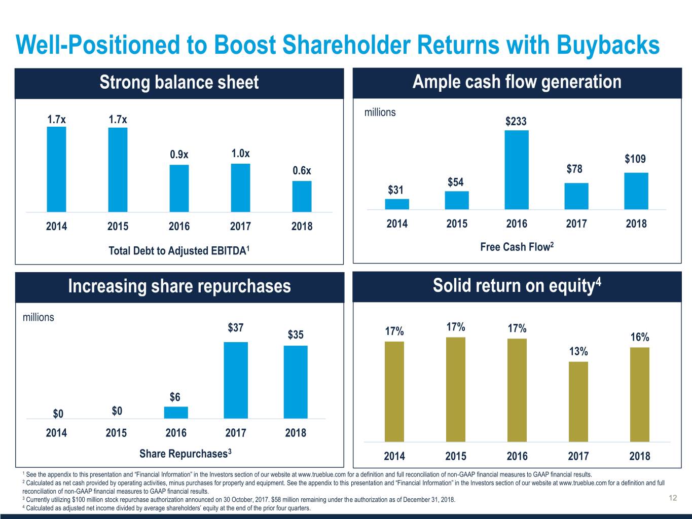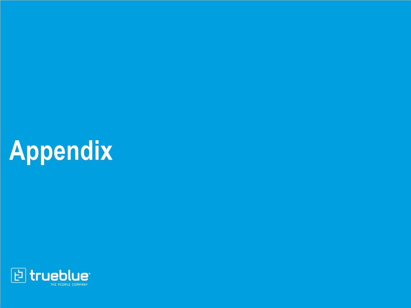 Well-Positioned to Boost Shareholder Returns with Buybacks millions 1.7x 1.7x $233 0.9x 1.0x $109 0.6x $78 $54 $31 2014 2015 2016 2017 2018 2014 2015 2016 2017 2018 2 Total Debt to Adjusted EBITDA1 Free Cash Flow Solid return on equity4 millions $37 17% 17% 17% $35 16% 13% $6 $0 $0 2014 2015 2016 2017 2018 Share Repurchases3 2014 2015 2016 2017 2018 1 See the appendix to this presentation and “Financial Information” in the Investors section of our website at www.trueblue.com for a definition and full reconciliation of non-GAAP financial measures to GAAP financial results. 2 Calculated as net cash provided by operating activities, minus purchases for property and equipment. See the appendix to this presentation and “Financial Information” in the Investors section of our website at www.trueblue.com for a definition and full reconciliation of non-GAAP financial measures to GAAP financial results. 3 Currently utilizing $100 million stock repurchase authorization announced on 30 October, 2017. $58 million remaining under the authorization as of December 31, 2018. 4 Calculated as adjusted net income divided by average shareholders’ equity at the end of the prior four quarters.