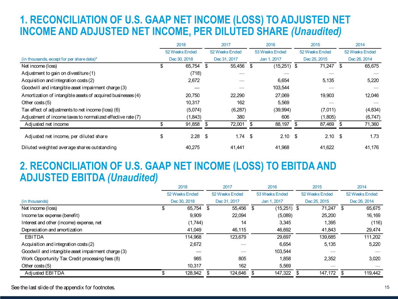 1. RECONCILIATION OF U.S. GAAP NET INCOME (LOSS) TO ADJUSTED NET INCOME AND ADJUSTED NET INCOME, PER DILUTED SHARE (Unaudited) 2018 2017 2016 2015 2014 52 Weeks Ended 52 Weeks Ended 53 Weeks Ended 52 Weeks Ended 52 Weeks Ended (in thousands, except for per share data)* Dec 30, 2018 Dec 31, 2017 Jan 1, 2017 Dec 25, 2015 Dec 26, 2014 Net income (loss) $ 65,754 $ 55,456 $ (15,251) $ 71,247 $ 65,675 Adjustment to gain on divestiture (1) (718) — — — — Acquisition and integration costs (2) 2,672 — 6,654 5,135 5,220 Goodwill and intangible asset impairment charge (3) — — 103,544 — — Amortization of intangible assets of acquired businesses (4) 20,750 22,290 27,069 19,903 12,046 Other costs (5) 10,317 162 5,569 — — Tax effect of adjustments to net income (loss) (6) (5,074) (6,287) (39,994) (7,011) (4,834) Adjustment of income taxes to normalized effective rate (7) (1,843) 380 606 (1,805) (6,747) Adjusted net income $ 91,858 $ 72,001 $ 88,197 $ 87,469 $ 71,360 Adjusted net income, per diluted share $ 2.28 $ 1.74 $ 2.10 $ 2.10 $ 1.73 Diluted weighted average shares outstanding 40,275 41,441 41,968 41,622 41,176 2. RECONCILIATION OF U.S. GAAP NET INCOME (LOSS) TO EBITDA AND ADJUSTED EBITDA (Unaudited) 2018 2017 2016 2015 2014 52 Weeks Ended 52 Weeks Ended 53 Weeks Ended 52 Weeks Ended 52 Weeks Ended (in thousands) Dec 30, 2018 Dec 31, 2017 Jan 1, 2017 Dec 25, 2015 Dec 26, 2014 Net income (loss) $ 65,754 $ 55,456 $ (15,251) $ 71,247 $ 65,675 Income tax expense (benefit) 9,909 22,094 (5,089) 25,200 16,169 Interest and other (income) expense, net (1,744) 14 3,345 1,395 (116) Depreciation and amortization 41,049 46,115 46,692 41,843 29,474 EBITDA 114,968 123,679 29,697 139,685 111,202 Acquisition and integration costs (2) 2,672 — 6,654 5,135 5,220 Goodwill and intangible asset impairment charge (3) — — 103,544 — — Work Opportunity Tax Credit processing fees (8) 985 805 1,858 2,352 3,020 Other costs (5) 10,317 162 5,569 — — Adjusted EBITDA $ 128,942 $ 124,646 $ 147,322 $ 147,172 $ 119,442 See the last slide of the appendix for footnotes. 15