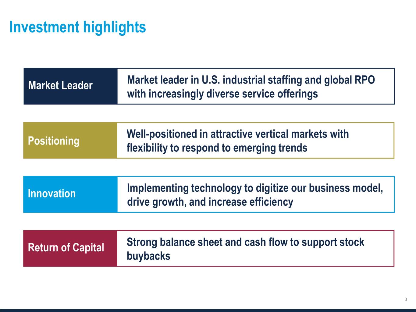 Segment strategy highlights 15%+ potential operating Attractive on-site solution Compelling value margin on incremental proposition with Perfect fit for larger attractive margins revenue clients with longer- duration / strategic need Global RPO market JobStackTM creating for contingent workers experiencing strong favorable differentiation growth with clients and Strength in the associates e-commerce vertical Leverage TMP acquisition to compete Focused on new client Goal to dispatch 4.5 on global opportunities wins and margin million shifts via expansion Industry leading JobStack in 2019 (1 proprietary technology – worker every 7 seconds) AffinixTM is a next- representing 50% digital generation HR tool fill rates Boost shareholder returns through share repurchase