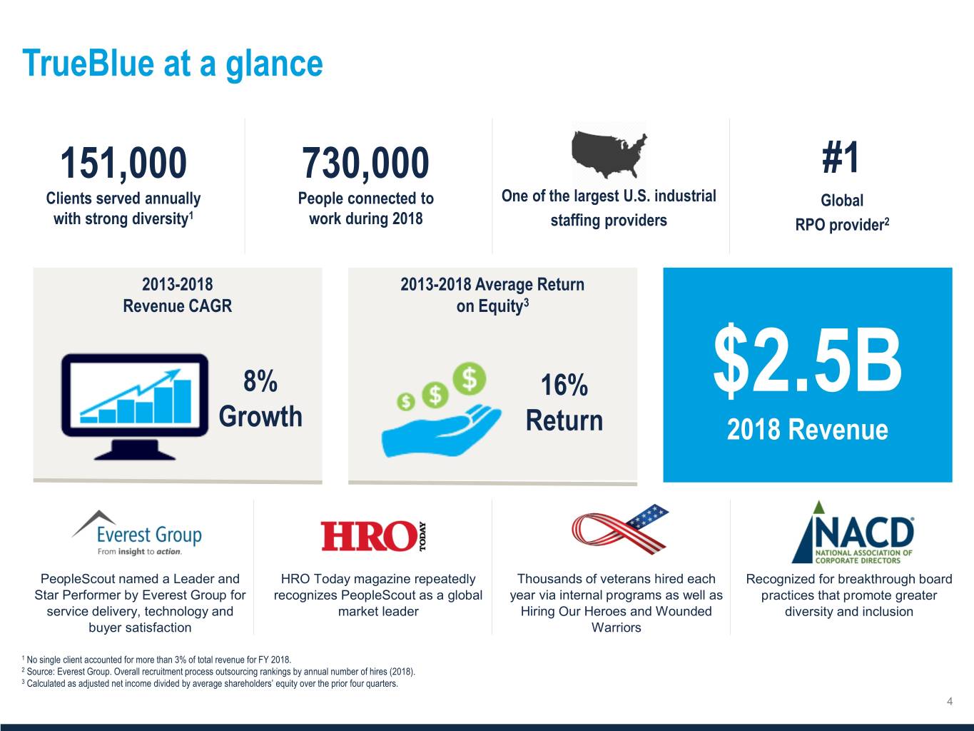 TrueBlue at a glance 151,000 730,000 #1 Clients served annually People connected to One of the largest U.S. industrial Global 1 with strong diversity work during 2018 staffing providers RPO provider2 2013-2018 2013-2018 Average Return Revenue CAGR on Equity3 8% 16% $2.5B Growth Return 2018 Revenue PeopleScout named a Leader and HRO Today magazine repeatedly Thousands of veterans hired each Recognized for breakthrough board Star Performer by Everest Group for recognizes PeopleScout as a global year via internal programs as well as practices that promote greater service delivery, technology and market leader Hiring Our Heroes and Wounded diversity and inclusion buyer satisfaction Warriors 1 No single client accounted for more than 3% of total revenue for FY 2018. 2 Source: Everest Group. Overall recruitment process outsourcing rankings by annual number of hires (2018). 3 Calculated as adjusted net income divided by average shareholders’ equity over the prior four quarters. 4