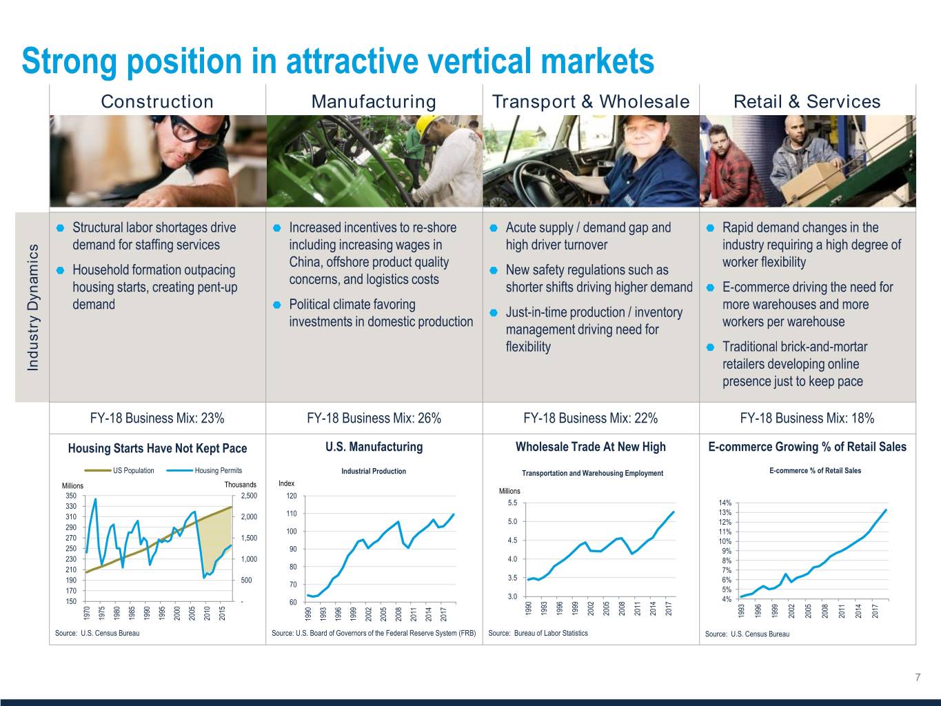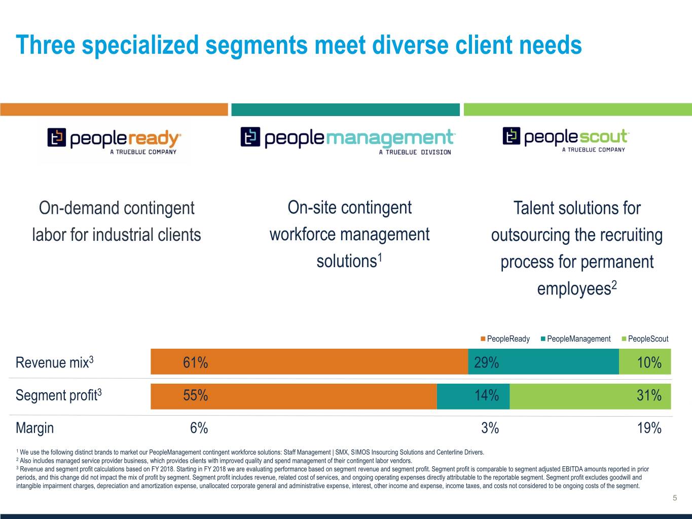 Three specialized segments meet diverse client needs On-site contingent Talent solutions for workforce management outsourcing the recruiting solutions1 process for permanent employees2 PeopleReady PeopleManagement PeopleScout Revenue mix3 61% 29% 10% Segment profit3 55% 14% 31% Margin 6% 3% 19% 1 We use the following distinct brands to market our PeopleManagement contingent workforce solutions: Staff Management | SMX, SIMOS Insourcing Solutions and Centerline Drivers. 2 Also includes managed service provider business, which provides clients with improved quality and spend management of their contingent labor vendors. 3 Revenue and segment profit calculations based on FY 2018. Starting in FY 2018 we are evaluating performance based on segment revenue and segment profit. Segment profit is comparable to segment adjusted EBITDA amounts reported in prior periods, and this change did not impact the mix of profit by segment. Segment profit includes revenue, related cost of services, and ongoing operating expenses directly attributable to the reportable segment. Segment profit excludes goodwill and intangible impairment charges, depreciation and amortization expense, unallocated corporate general and administrative expense, interest, other income and expense, income taxes, and costs not considered to be ongoing costs of the segment.
