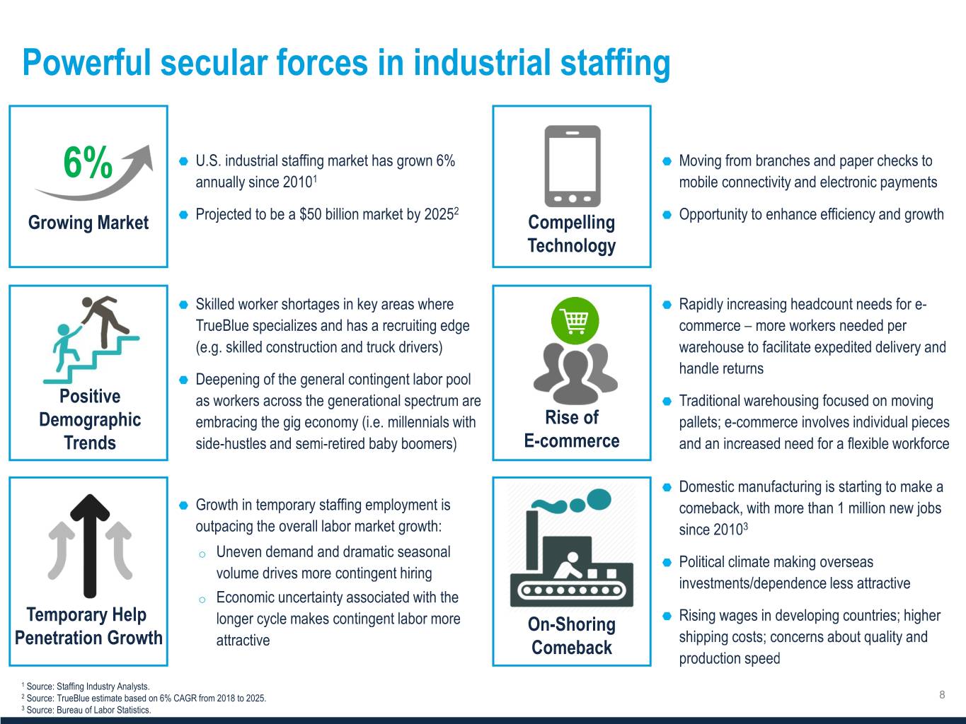 Well-Positioned to Boost Shareholder Returns with Buybacks millions 1.7x 1.7x $233 0.9x 1.0x $109 0.6x $78 $54 $31 2014 2015 2016 2017 2018 2014 2015 2016 2017 2018 2 Total Debt to Adjusted EBITDA1 Free Cash Flow Solid return on equity4 millions $37 17% 17% 17% $35 16% 13% $6 $0 $0 2014 2015 2016 2017 2018 Share Repurchases3 2014 2015 2016 2017 2018 1 See the appendix to this presentation and “Financial Information” in the Investors section of our website at www.trueblue.com for a definition and full reconciliation of non-GAAP financial measures to GAAP financial results. 2 Calculated as net cash provided by operating activities, minus purchases for property and equipment. See the appendix to this presentation and “Financial Information” in the Investors section of our website at www.trueblue.com for a definition and full reconciliation of non-GAAP financial measures to GAAP financial results. 3 As of December 31, 2018, $58 million was remaining under the $100 million stock repurchase authorization announced on 30 October, 2017. 4 Calculated as adjusted net income divided by average shareholders’ equity at the end of the prior four quarters.