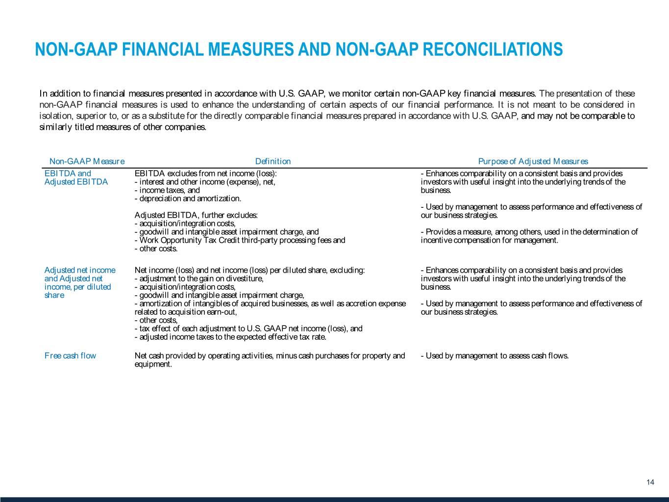 NON-GAAP FINANCIAL MEASURES AND NON-GAAP RECONCILIATIONS In addition to financial measures presented in accordance with U.S. GAAP, we monitor certain non-GAAP key financial measures. The presentation of these non-GAAP financial measures is used to enhance the understanding of certain aspects of our financial performance. It is not meant to be considered in isolation, superior to, or as a substitute for the directly comparable financial measures prepared in accordance with U.S. GAAP, and may not be comparable to similarly titled measures of other companies. Non-GAAP Measure Definition Purpose of Adjusted Measures EBITDA and EBITDA excludes from net income (loss): - Enhances comparability on a consistent basis and provides Adjusted EBITDA - interest and other income (expense), net, investors with useful insight into the underlying trends of the - income taxes, and business. - depreciation and amortization. - Used by management to assess performance and effectiveness of Adjusted EBITDA, further excludes: our business strategies. - acquisition/integration costs, - goodwill and intangible asset impairment charge, and - Provides a measure, among others, used in the determination of - Work Opportunity Tax Credit third-party processing fees and incentive compensation for management. - other costs. Adjusted net income Net income (loss) and net income (loss) per diluted share, excluding: - Enhances comparability on a consistent basis and provides and Adjusted net - adjustment to the gain on divestiture, investors with useful insight into the underlying trends of the income, per diluted - acquisition/integration costs, business. share - goodwill and intangible asset impairment charge, - amortization of intangibles of acquired businesses, as well as accretion expense - Used by management to assess performance and effectiveness of related to acquisition earn-out, our business strategies. - other costs, - tax effect of each adjustment to U.S. GAAP net income (loss), and - adjusted income taxes to the expected effective tax rate. Free cash flow Net cash provided by operating activities, minus cash purchases for property and - Used by management to assess cash flows. equipment. 14