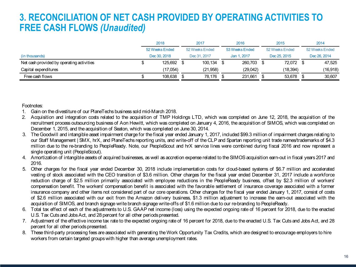 3. RECONCILIATION OF NET CASH PROVIDED BY OPERATING ACTIVITIES TO FREE CASH FLOWS (Unaudited) 2018 2017 2016 2015 2014 52 Weeks Ended 52 Weeks Ended 53 Weeks Ended 52 Weeks Ended 52 Weeks Ended (in thousands) Dec 30, 2018 Dec 31, 2017 Jan 1, 2017 Dec 25, 2015 Dec 26, 2014 Net cash provided by operating activities $ 125,692 $ 100,134 $ 260,703 $ 72,072 $ 47,525 Capital expenditures (17,054) (21,958) (29,042) (18,394) (16,918) Free cash flows $ 108,638 $ 78,176 $ 231,661 $ 53,678 $ 30,607 Footnotes: 1. Gain on the divestiture of our PlaneTechs business sold mid-March 2018. 2. Acquisition and integration costs related to the acquisition of TMP Holdings LTD, which was completed on June 12, 2018, the acquisition of the recruitment process outsourcing business of Aon Hewitt, which was completed on January 4, 2016, the acquisition of SIMOS, which was completed on December 1, 2015, and the acquisition of Seaton, which was completed on June 30, 2014. 3. The Goodwill and intangible asset impairment charge for the fiscal year ended January 1, 2017, included $99.3 million of impairment charges relating to our Staff Management | SMX, hrX, and PlaneTechs reporting units, and write-off of the CLP and Spartan reporting unit trade names/trademarks of $4.3 million due to the re-branding to PeopleReady. Note, our PeopleScout and hrX service lines were combined during fiscal 2016 and now represent a single operating unit (PeopleScout). 4. Amortization of intangible assets of acquired businesses, as well as accretion expense related to the SIMOS acquisition earn-out in fiscal years 2017 and 2016. 5. Other charges for the fiscal year ended December 30, 2018 include implementation costs for cloud-based systems of $6.7 million and accelerated vesting of stock associated with the CEO transition of $3.6 million. Other charges for the fiscal year ended December 31, 2017 include a workforce reduction charge of $2.5 million primarily associated with employee reductions in the PeopleReady business, offset by $2.3 million of workers' compensation benefit. The workers' compensation benefit is associated with the favorable settlement of insurance coverage associated with a former insurance company and other items not considered part of our core operations. Other charges for the fiscal year ended January 1, 2017, consist of costs of $2.6 million associated with our exit from the Amazon delivery business, $1.3 million adjustment to increase the earn-out associated with the acquisition of SIMOS, and branch signage write branch signage write-offs of $1.6 million due to our re-branding to PeopleReady. 6. Total tax effect of each of the adjustments to U.S. GAAP net income (loss) using the expected ongoing rate of 16 percent for 2018, due to the enacted U.S. Tax Cuts and Jobs Act, and 28 percent for all other periods presented. 7. Adjustment of the effective income tax rate to the expected ongoing rate of 16 percent for 2018, due to the enacted U.S. Tax Cuts and Jobs Act, and 28 percent for all other periods presented. 8. These third-party processing fees are associated with generating the Work Opportunity Tax Credits, which are designed to encourage employers to hire workers from certain targeted groups with higher than average unemployment rates. 16