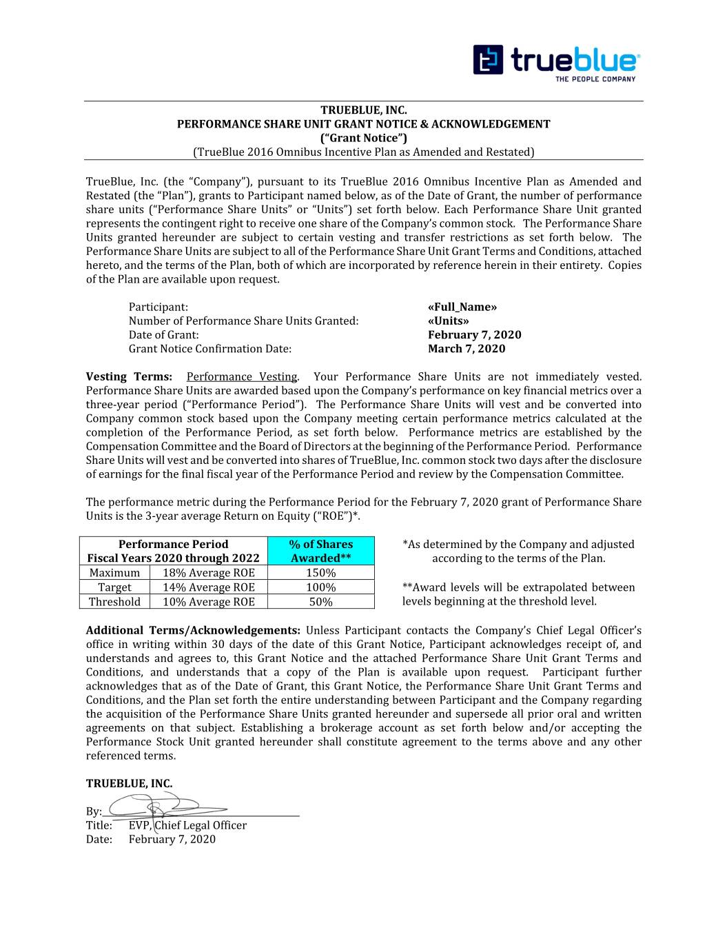 TRUEBLUE, INC. PERFORMANCE SHARE UNIT GRANT NOTICE & ACKNOWLEDGEMENT (“Grant Notice”) (TrueBlue 2016 Omnibus Incentive Plan as Amended and Restated) TrueBlue, Inc. (the “Company”), pursuant to its TrueBlue 2016 Omnibus Incentive Plan as Amended and Restated (the “Plan”), grants to Participant named below, as of the Date of Grant, the number of performance share units (“Performance Share Units” or “Units”) set forth below. Each Performance Share Unit granted represents the contingent right to receive one share of the Company’s common stock. The Performance Share Units granted hereunder are subject to certain vesting and transfer restrictions as set forth below. The Performance Share Units are subject to all of the Performance Share Unit Grant Terms and Conditions, attached hereto, and the terms of the Plan, both of which are incorporated by reference herein in their entirety. Copies of the Plan are available upon request. Participant: «Full_Name» Number of Performance Share Units Granted: «Units» Date of Grant: February 7, 2020 Grant Notice Confirmation Date: March 7, 2020 Vesting Terms: Performance Vesting. Your Performance Share Units are not immediately vested. Performance Share Units are awarded based upon the Company’s performance on key financial metrics over a three‐year period (“Performance Period”). The Performance Share Units will vest and be converted into Company common stock based upon the Company meeting certain performance metrics calculated at the completion of the Performance Period, as set forth below. Performance metrics are established by the Compensation Committee and the Board of Directors at the beginning of the Performance Period. Performance Share Units will vest and be converted into shares of TrueBlue, Inc. common stock two days after the disclosure of earnings for the final fiscal year of the Performance Period and review by the Compensation Committee. The performance metric during the Performance Period for the February 7, 2020 grant of Performance Share Units is the 3‐year average Return on Equity (“ROE”)*. Performance Period % of Shares *As determined by the Company and adjusted Fiscal Years 2020 through 2022 Awarded** according to the terms of the Plan. Maximum 18% Average ROE 150% Target 14% Average ROE 100% **Award levels will be extrapolated between Threshold 10% Average ROE 50% levels beginning at the threshold level. Additional Terms/Acknowledgements: Unless Participant contacts the Company’s Chief Legal Officer’s office in writing within 30 days of the date of this Grant Notice, Participant acknowledges receipt of, and understands and agrees to, this Grant Notice and the attached Performance Share Unit Grant Terms and Conditions, and understands that a copy of the Plan is available upon request. Participant further acknowledges that as of the Date of Grant, this Grant Notice, the Performance Share Unit Grant Terms and Conditions, and the Plan set forth the entire understanding between Participant and the Company regarding the acquisition of the Performance Share Units granted hereunder and supersede all prior oral and written agreements on that subject. Establishing a brokerage account as set forth below and/or accepting the Performance Stock Unit granted hereunder shall constitute agreement to the terms above and any other referenced terms. TRUEBLUE, INC. By: Title: EVP, Chief Legal Officer Date: February 7, 2020