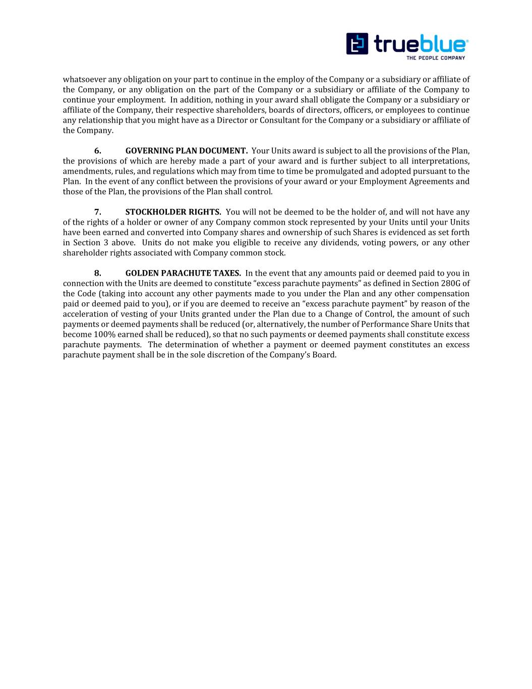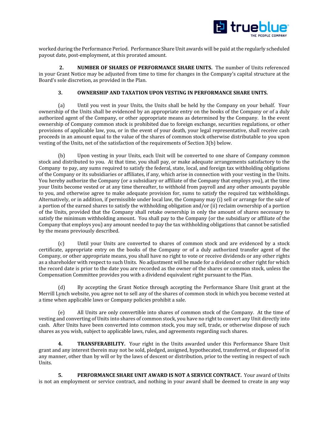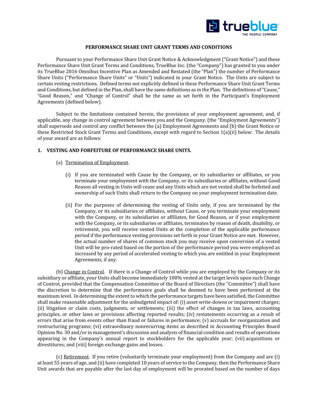 PERFORMANCE SHARE UNIT GRANT TERMS AND CONDITIONS Pursuant to your Performance Share Unit Grant Notice & Acknowledgment (“Grant Notice”) and these Performance Share Unit Grant Terms and Conditions, TrueBlue Inc. (the “Company”) has granted to you under its TrueBlue 2016 Omnibus Incentive Plan as Amended and Restated (the “Plan”) the number of Performance Share Units (“Performance Share Units” or “Units”) indicated in your Grant Notice. The Units are subject to certain vesting restrictions. Defined terms not explicitly defined in these Performance Share Unit Grant Terms and Conditions, but defined in the Plan, shall have the same definitions as in the Plan. The definitions of “Cause,” “Good Reason,” and “Change of Control” shall be the same as set forth in the Participant’s Employment Agreements (defined below). Subject to the limitations contained herein, the provisions of your employment agreement, and, if applicable, any change in control agreement between you and the Company, (the “Employment Agreements”) shall supersede and control any conflict between the (a) Employment Agreements and (b) the Grant Notice or these Restricted Stock Grant Terms and Conditions, except with regard to Section 1(a)(ii) below. The details of your award are as follows: 1. VESTING AND FORFEITURE OF PERFORMANCE SHARE UNITS. (a) Termination of Employment. (i) If you are terminated with Cause by the Company, or its subsidiaries or affiliates, or you terminate your employment with the Company, or its subsidiaries or affiliates, without Good Reason all vesting in Units will cease and any Units which are not vested shall be forfeited and ownership of such Units shall return to the Company on your employment termination date. (ii) For the purposes of determining the vesting of Units only, if you are terminated by the Company, or its subsidiaries or affiliates, without Cause, or you terminate your employment with the Company, or its subsidiaries or affiliates, for Good Reason, or if your employment with the Company, or its subsidiaries or affiliates, terminates by reason of death, disability, or retirement, you will receive vested Units at the completion of the applicable performance period if the performance vesting provisions set forth in your Grant Notice are met. However, the actual number of shares of common stock you may receive upon conversion of a vested Unit will be pro‐rated based on the portion of the performance period you were employed as increased by any period of accelerated vesting to which you are entitled in your Employment Agreements, if any. (b) Change in Control. If there is a Change of Control while you are employed by the Company or its subsidiary or affiliate, your Units shall become immediately 100% vested at the target levels upon such Change of Control, provided that the Compensation Committee of the Board of Directors (the “Committee”) shall have the discretion to determine that the performance goals shall be deemed to have been performed at the maximum level. In determining the extent to which the performance targets have been satisfied, the Committee shall make reasonable adjustment for the unbudgeted impact of: (i) asset write‐downs or impairment charges; (ii) litigation or claim costs, judgments, or settlements; (iii) the effect of changes in tax laws, accounting principles, or other laws or provisions affecting reported results; (iv) restatements occurring as a result of errors that arise from events other than fraud or failures in performance; (v) accruals for reorganization and restructuring programs; (vi) extraordinary nonrecurring items as described in Accounting Principles Board Opinion No. 30 and/or in management’s discussion and analysis of financial condition and results of operations appearing in the Company’s annual report to stockholders for the applicable year; (vii) acquisitions or divestitures; and (viii) foreign exchange gains and losses. (c) Retirement. If you retire (voluntarily terminate your employment) from the Company and are (i) at least 55 years of age, and (ii) have completed 10 years of service to the Company, then the Performance Share Unit awards that are payable after the last day of employment will be prorated based on the number of days