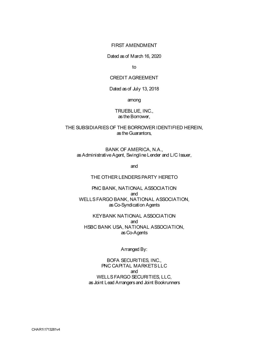FIRST AMENDMENT Dated as of March 16, 2020 to CREDIT AGREEMENT Dated as of July 13, 2018 among TRUEBLUE, INC., as the Borrower, THE SUBSIDIARIES OF THE BORROWER IDENTIFIED HEREIN, as the Guarantors, BANK OF AMERICA, N.A., as Administrative Agent, Swingline Lender and L/C Issuer, and THE OTHER LENDERS PARTY HERETO PNC BANK, NATIONAL ASSOCIATION and WELLS FARGO BANK, NATIONAL ASSOCIATION, as Co-Syndication Agents KEYBANK NATIONAL ASSOCIATION and HSBC BANK USA, NATIONAL ASSOCIATION, as Co-Agents Arranged By: BOFA SECURITIES, INC., PNC CAPITAL MARKETS LLC and WELLS FARGO SECURITIES, LLC, as Joint Lead Arrangers and Joint Bookrunners CHAR1\1713281v4