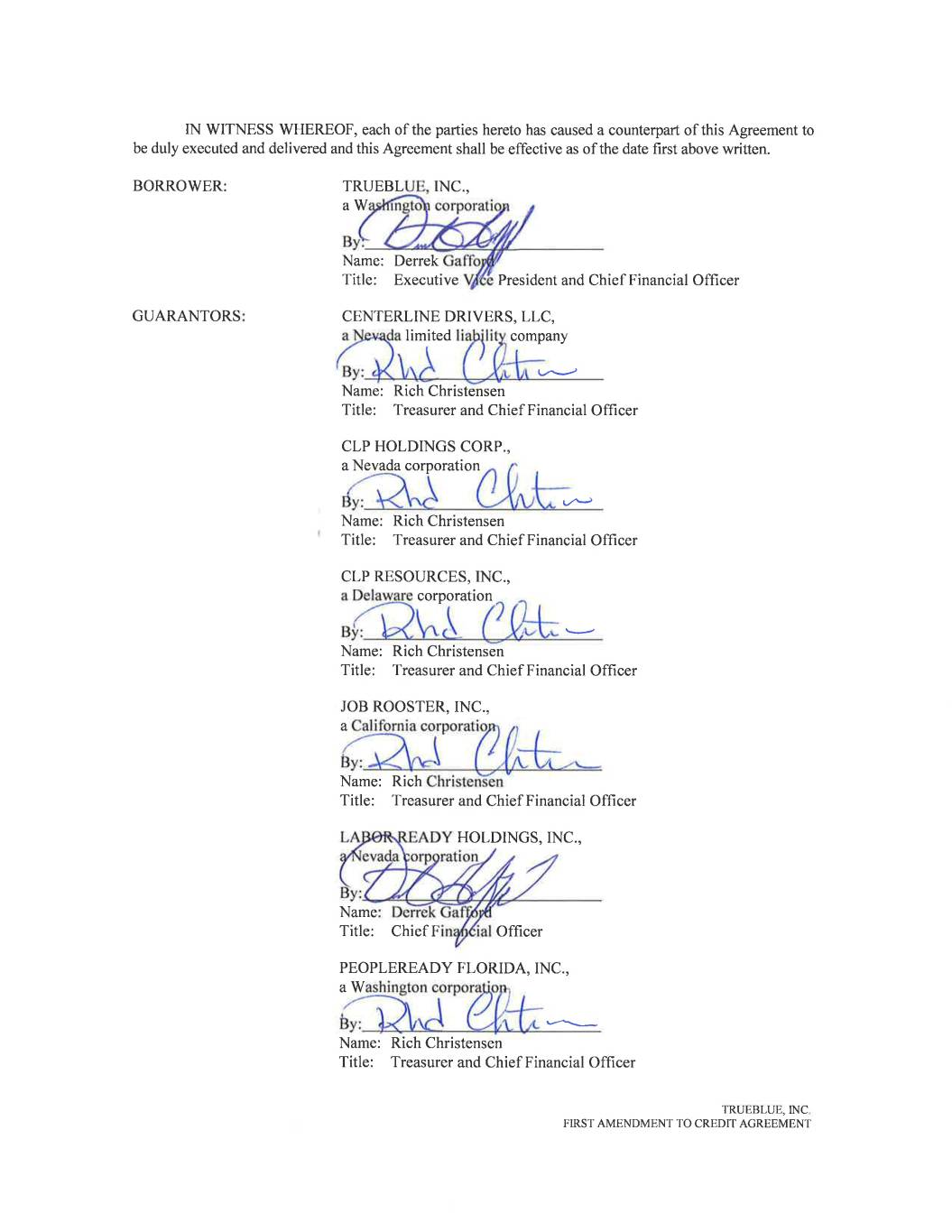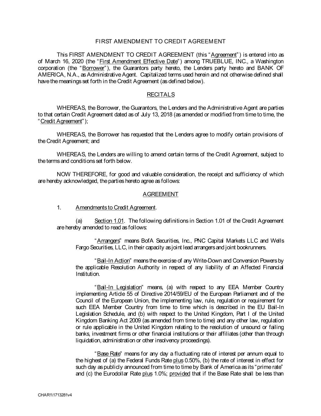 FIRST AMENDMENT TO CREDIT AGREEMENT This FIRST AMENDMENT TO CREDIT AGREEMENT (this “Agreement”) is entered into as of March 16, 2020 (the “First Amendment Effective Date”) among TRUEBLUE, INC., a Washington corporation (the “Borrower”), the Guarantors party hereto, the Lenders party hereto and BANK OF AMERICA, N.A., as Administrative Agent. Capitalized terms used herein and not otherwise defined shall have the meanings set forth in the Credit Agreement (as defined below). RECITALS WHEREAS, the Borrower, the Guarantors, the Lenders and the Administrative Agent are parties to that certain Credit Agreement dated as of July 13, 2018 (as amended or modified from time to time, the “Credit Agreement”); WHEREAS, the Borrower has requested that the Lenders agree to modify certain provisions of the Credit Agreement; and WHEREAS, the Lenders are willing to amend certain terms of the Credit Agreement, subject to the terms and conditions set forth below. NOW THEREFORE, for good and valuable consideration, the receipt and sufficiency of which are hereby acknowledged, the parties hereto agree as follows: AGREEMENT 1. Amendments to Credit Agreement. (a) Section 1.01. The following definitions in Section 1.01 of the Credit Agreement are hereby amended to read as follows: “Arrangers” means BofA Securities, Inc., PNC Capital Markets LLC and Wells Fargo Securities, LLC, in their capacity as joint lead arrangers and joint bookrunners. “Bail-In Action” means the exercise of any Write-Down and Conversion Powers by the applicable Resolution Authority in respect of any liability of an Affected Financial Institution. “Bail-In Legislation” means, (a) with respect to any EEA Member Country implementing Article 55 of Directive 2014/59/EU of the European Parliament and of the Council of the European Union, the implementing law, rule, regulation or requirement for such EEA Member Country from time to time which is described in the EU Bail-In Legislation Schedule, and (b) with respect to the United Kingdom, Part I of the United Kingdom Banking Act 2009 (as amended from time to time) and any other law, regulation or rule applicable in the United Kingdom relating to the resolution of unsound or failing banks, investment firms or other financial institutions or their affiliates (other than through liquidation, administration or other insolvency proceedings). “Base Rate” means for any day a fluctuating rate of interest per annum equal to the highest of (a) the Federal Funds Rate plus 0.50%, (b) the rate of interest in effect for such day as publicly announced from time to time by Bank of America as its “prime rate” and (c) the Eurodollar Rate plus 1.0%; provided that if the Base Rate shall be less than CHAR1\1713281v4