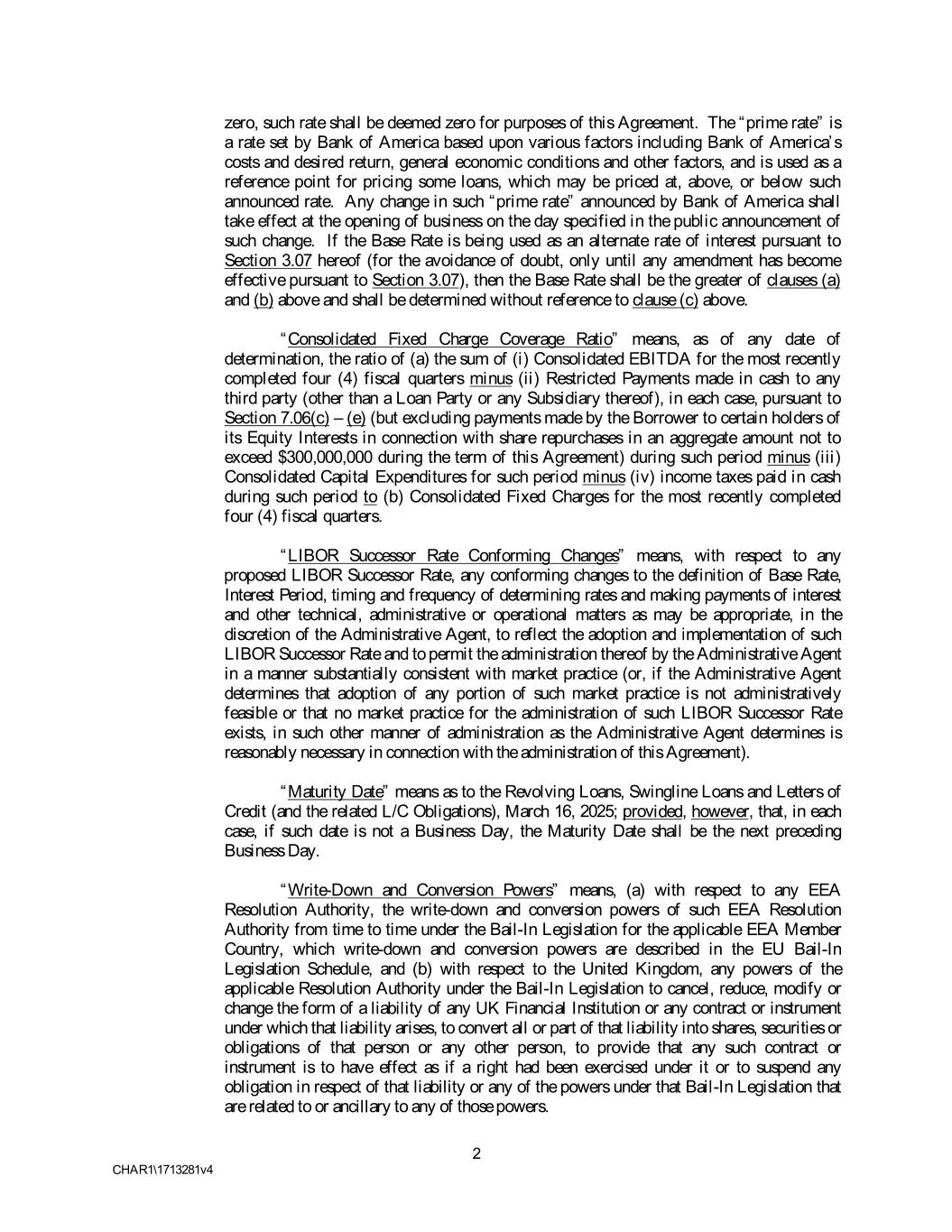 zero, such rate shall be deemed zero for purposes of this Agreement. The “prime rate” is a rate set by Bank of America based upon various factors including Bank of America’s costs and desired return, general economic conditions and other factors, and is used as a reference point for pricing some loans, which may be priced at, above, or below such announced rate. Any change in such “prime rate” announced by Bank of America shall take effect at the opening of business on the day specified in the public announcement of such change. If the Base Rate is being used as an alternate rate of interest pursuant to Section 3.07 hereof (for the avoidance of doubt, only until any amendment has become effective pursuant to Section 3.07), then the Base Rate shall be the greater of clauses (a) and (b) above and shall be determined without reference to clause (c) above. “Consolidated Fixed Charge Coverage Ratio” means, as of any date of determination, the ratio of (a) the sum of (i) Consolidated EBITDA for the most recently completed four (4) fiscal quarters minus (ii) Restricted Payments made in cash to any third party (other than a Loan Party or any Subsidiary thereof), in each case, pursuant to Section 7.06(c) – (e) (but excluding payments made by the Borrower to certain holders of its Equity Interests in connection with share repurchases in an aggregate amount not to exceed $300,000,000 during the term of this Agreement) during such period minus (iii) Consolidated Capital Expenditures for such period minus (iv) income taxes paid in cash during such period to (b) Consolidated Fixed Charges for the most recently completed four (4) fiscal quarters. “LIBOR Successor Rate Conforming Changes” means, with respect to any proposed LIBOR Successor Rate, any conforming changes to the definition of Base Rate, Interest Period, timing and frequency of determining rates and making payments of interest and other technical, administrative or operational matters as may be appropriate, in the discretion of the Administrative Agent, to reflect the adoption and implementation of such LIBOR Successor Rate and to permit the administration thereof by the Administrative Agent in a manner substantially consistent with market practice (or, if the Administrative Agent determines that adoption of any portion of such market practice is not administratively feasible or that no market practice for the administration of such LIBOR Successor Rate exists, in such other manner of administration as the Administrative Agent determines is reasonably necessary in connection with the administration of this Agreement). “Maturity Date” means as to the Revolving Loans, Swingline Loans and Letters of Credit (and the related L/C Obligations), March 16, 2025; provided, however, that, in each case, if such date is not a Business Day, the Maturity Date shall be the next preceding Business Day. “Write-Down and Conversion Powers” means, (a) with respect to any EEA Resolution Authority, the write-down and conversion powers of such EEA Resolution Authority from time to time under the Bail-In Legislation for the applicable EEA Member Country, which write-down and conversion powers are described in the EU Bail-In Legislation Schedule, and (b) with respect to the United Kingdom, any powers of the applicable Resolution Authority under the Bail-In Legislation to cancel, reduce, modify or change the form of a liability of any UK Financial Institution or any contract or instrument under which that liability arises, to convert all or part of that liability into shares, securities or obligations of that person or any other person, to provide that any such contract or instrument is to have effect as if a right had been exercised under it or to suspend any obligation in respect of that liability or any of the powers under that Bail-In Legislation that are related to or ancillary to any of those powers. 2 CHAR1\1713281v4