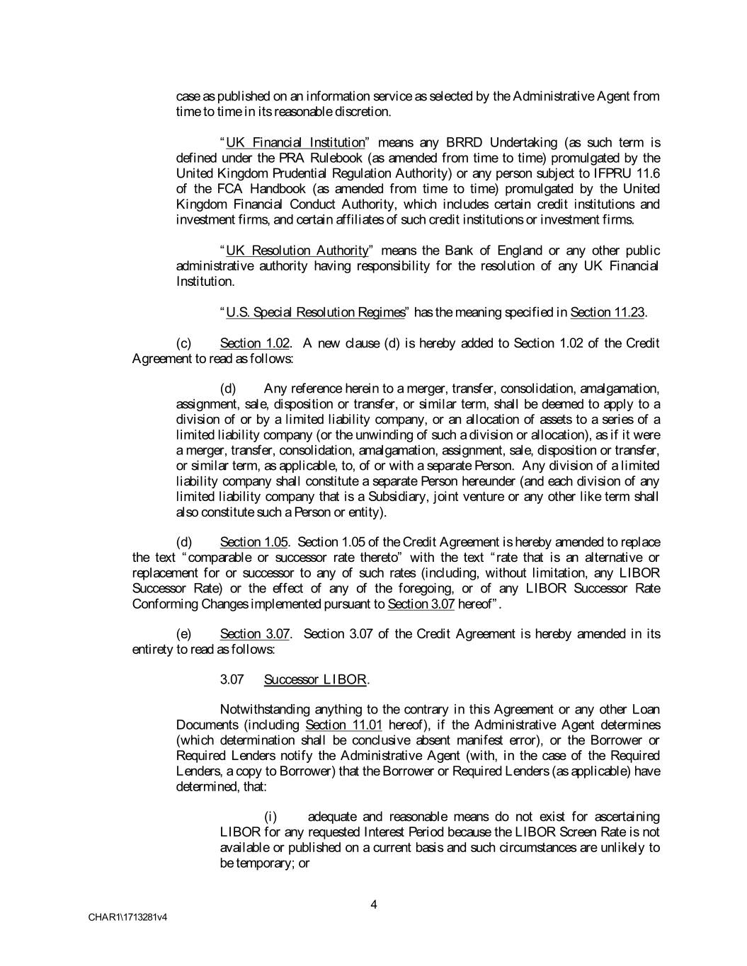 case as published on an information service as selected by the Administrative Agent from time to time in its reasonable discretion. “UK Financial Institution” means any BRRD Undertaking (as such term is defined under the PRA Rulebook (as amended from time to time) promulgated by the United Kingdom Prudential Regulation Authority) or any person subject to IFPRU 11.6 of the FCA Handbook (as amended from time to time) promulgated by the United Kingdom Financial Conduct Authority, which includes certain credit institutions and investment firms, and certain affiliates of such credit institutions or investment firms. “UK Resolution Authority” means the Bank of England or any other public administrative authority having responsibility for the resolution of any UK Financial Institution. “U.S. Special Resolution Regimes” has the meaning specified in Section 11.23. (c) Section 1.02. A new clause (d) is hereby added to Section 1.02 of the Credit Agreement to read as follows: (d) Any reference herein to a merger, transfer, consolidation, amalgamation, assignment, sale, disposition or transfer, or similar term, shall be deemed to apply to a division of or by a limited liability company, or an allocation of assets to a series of a limited liability company (or the unwinding of such a division or allocation), as if it were a merger, transfer, consolidation, amalgamation, assignment, sale, disposition or transfer, or similar term, as applicable, to, of or with a separate Person. Any division of a limited liability company shall constitute a separate Person hereunder (and each division of any limited liability company that is a Subsidiary, joint venture or any other like term shall also constitute such a Person or entity). (d) Section 1.05. Section 1.05 of the Credit Agreement is hereby amended to replace the text “comparable or successor rate thereto” with the text “rate that is an alternative or replacement for or successor to any of such rates (including, without limitation, any LIBOR Successor Rate) or the effect of any of the foregoing, or of any LIBOR Successor Rate Conforming Changes implemented pursuant to Section 3.07 hereof”. (e) Section 3.07. Section 3.07 of the Credit Agreement is hereby amended in its entirety to read as follows: 3.07 Successor LIBOR. Notwithstanding anything to the contrary in this Agreement or any other Loan Documents (including Section 11.01 hereof), if the Administrative Agent determines (which determination shall be conclusive absent manifest error), or the Borrower or Required Lenders notify the Administrative Agent (with, in the case of the Required Lenders, a copy to Borrower) that the Borrower or Required Lenders (as applicable) have determined, that: (i) adequate and reasonable means do not exist for ascertaining LIBOR for any requested Interest Period because the LIBOR Screen Rate is not available or published on a current basis and such circumstances are unlikely to be temporary; or 4 CHAR1\1713281v4